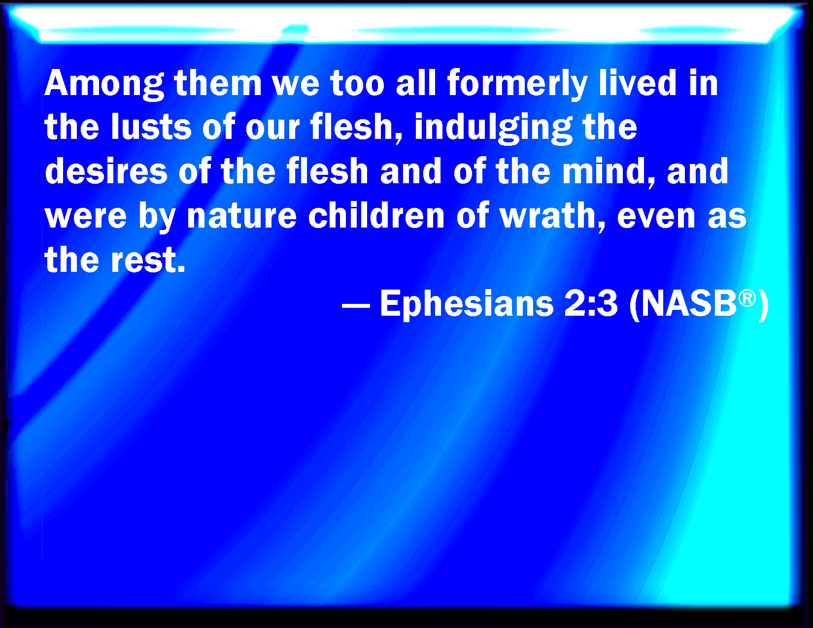 Bible Verse Slide Ephesians 2:3 Among whom also we all had our conversation in times past in the lusts of our flesh, fulfilling the desires of the flesh and of the mind; and were by nature the children of wrath, even as others. KJV: Among whom also we all had our conversation in times past in the lusts of our flesh, fulfilling the desires of the flesh and of the mind; and were by nature the children of wrath, even as others. DRB: In which also we all conversed in time past, in the desires of our flesh, fulfilling the will of the flesh and of our thoughts, and were by nature children of wrath, even as the rest: DBT: among whom we also all once had our conversation in the lusts of our flesh, doing what the flesh and the thoughts willed to do, and were children, by nature, of wrath, even as the rest: ERV: among whom we also all once lived in the lusts of our flesh, doing the desires of the flesh and of the mind, and were by nature children of wrath, even as the rest:— WBT: Among whom also we all had our manner of life in times past in the lusts of our flesh, fulfilling the desires of the flesh and of the mind; and were by nature the children of wrath, even as others. WEB: among whom we also all once lived in the lust of our flesh, doing the desires of the flesh and of the mind, and were by nature children of wrath, even as the rest. YLT: among whom also we all did walk once in the desires of our flesh, doing the wishes of the flesh and of the thoughts, and were by nature children of wrath — as also the others,Links Ephesians 2:3 NIV • Ephesians 2:3 NLT • Ephesians 2:3 ESV • Ephesians 2:3 NASB • Ephesians 2:3 KJV • Ephesians 2:3 Interlinear • Ephesians 2:3 Commentaries • Ephesians 2:3 Parallel Texts • Ephesians 2:3 Bible Apps • Ephesians 2:3 Parallel • Bible Hub |