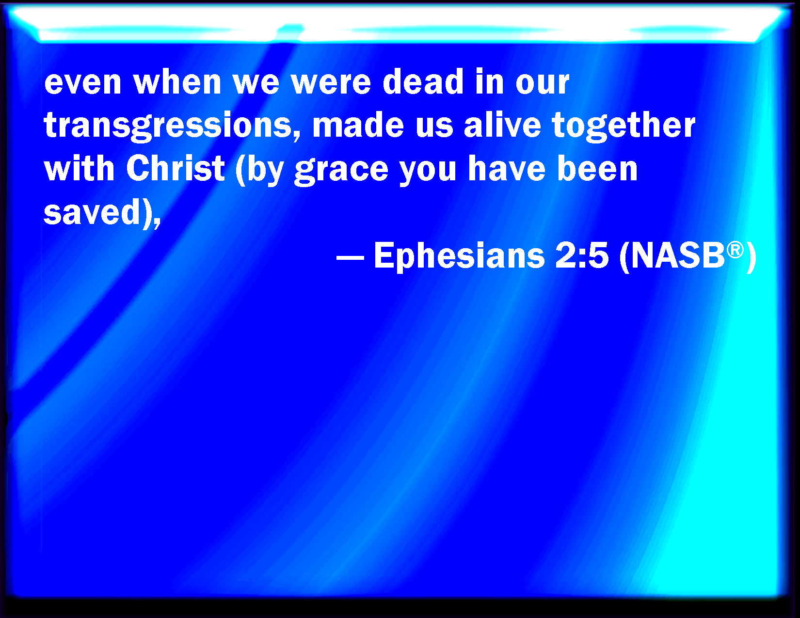 Bible Verse Slide Ephesians 2:5 Even when we were dead in sins, has quickened us together with Christ, (by grace you are saved;) KJV: Even when we were dead in sins, hath quickened us together with Christ, (by grace ye are saved;) DRB: Even when we were dead in sins, hath quickened us together in Christ, (by whose grace you are saved,) DBT: (we too being dead in offences,) has quickened us with the Christ, (ye are saved by grace,) ERV: even when we were dead through our trespasses, quickened us together with Christ (by grace have ye been saved), WBT: Even when we were dead in sins, hath made us alive together with Christ, (by grace ye are saved;) WEB: even when we were dead through our trespasses, made us alive together with Christ (by grace you have been saved), YLT: even being dead in the trespasses, did make us to live together with the Christ, (by grace ye are having been saved,)Links Ephesians 2:5 NIV • Ephesians 2:5 NLT • Ephesians 2:5 ESV • Ephesians 2:5 NASB • Ephesians 2:5 KJV • Ephesians 2:5 Interlinear • Ephesians 2:5 Commentaries • Ephesians 2:5 Parallel Texts • Ephesians 2:5 Bible Apps • Ephesians 2:5 Parallel • Bible Hub |