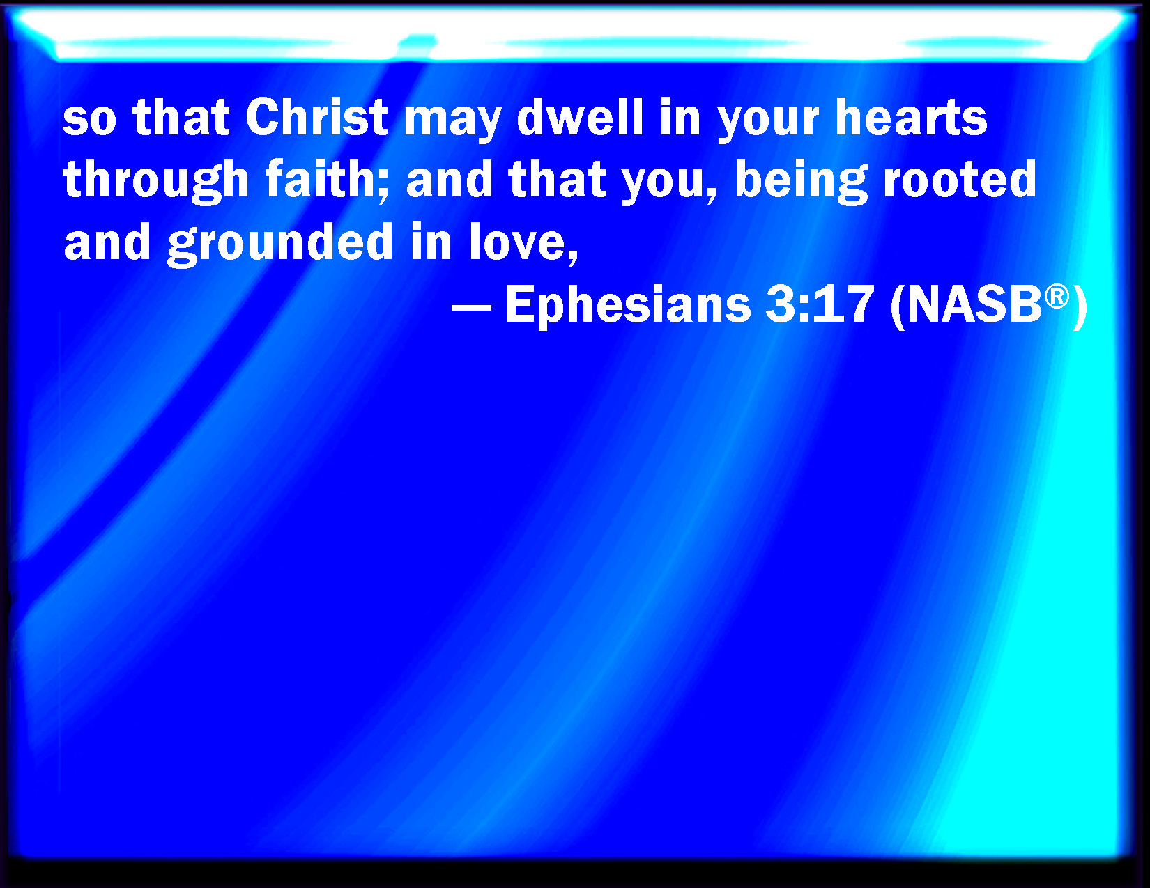 Bible Verse Slide Ephesians 3:17 That Christ may dwell in your hearts by faith; that you, being rooted and grounded in love, KJV: That Christ may dwell in your hearts by faith; that ye, being rooted and grounded in love, DRB: That Christ may dwell by faith in your hearts; that being rooted and founded in charity, DBT: that the Christ may dwell, through faith, in your hearts, being rooted and founded in love, ERV: that Christ may dwell in your hearts through faith; to the end that ye, being rooted and grounded in love, WBT: That Christ may dwell in your hearts by faith; that ye, being rooted and grounded in love, WEB: that Christ may dwell in your hearts through faith; to the end that you, being rooted and grounded in love, YLT: that the Christ may dwell through the faith in your hearts, in love having been rooted and founded,Links Ephesians 3:17 NIV • Ephesians 3:17 NLT • Ephesians 3:17 ESV • Ephesians 3:17 NASB • Ephesians 3:17 KJV • Ephesians 3:17 Interlinear • Ephesians 3:17 Commentaries • Ephesians 3:17 Parallel Texts • Ephesians 3:17 Bible Apps • Ephesians 3:17 Parallel • Bible Hub |