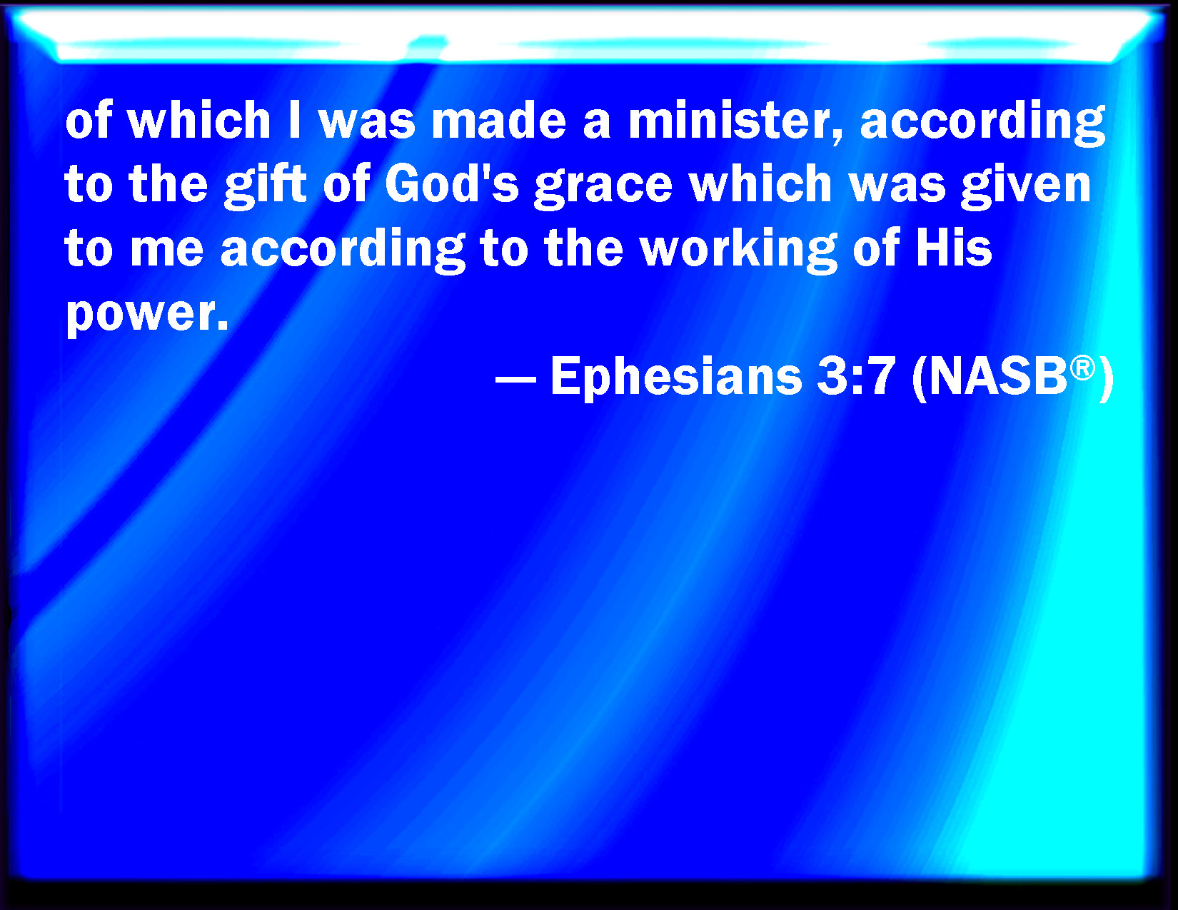 Bible Verse Slide Ephesians 3:7 Whereof I was made a minister, according to the gift of the grace of God given to me by the effectual working of his power. KJV: Whereof I was made a minister, according to the gift of the grace of God given unto me by the effectual working of his power. DRB: Of which I am made a minister, according to the gift of the grace of God, which is given to me according to the operation of his power: DBT: of which I am become minister according to the gift of the grace of God given to me, according to the working of his power. ERV: whereof I was made a minister, according to the gift of that grace of God which was given me according to the working of his power. WBT: Of which I was made a minister, according to the gift of the grace of God given to me by the effectual working of his power. WEB: of which I was made a servant, according to the gift of that grace of God which was given me according to the working of his power. YLT: of which I became a ministrant, according to the gift of the grace of God that was given to me, according to the working of His power;Links Ephesians 3:7 NIV • Ephesians 3:7 NLT • Ephesians 3:7 ESV • Ephesians 3:7 NASB • Ephesians 3:7 KJV • Ephesians 3:7 Interlinear • Ephesians 3:7 Commentaries • Ephesians 3:7 Parallel Texts • Ephesians 3:7 Bible Apps • Ephesians 3:7 Parallel • Bible Hub |