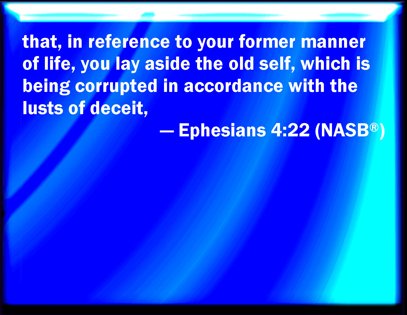Bible Verse Slide Ephesians 4:22 That you put off concerning the former conversation the old man, which is corrupt according to the deceitful lusts; KJV: That ye put off concerning the former conversation the old man, which is corrupt according to the deceitful lusts; DRB: To put off, according to former conversation, the old man, who is corrupted according to the desire of error. DBT: namely your having put off according to the former conversation the old man which corrupts itself according to the deceitful lusts; ERV: that ye put away, as concerning your former manner of life, the old man, which waxeth corrupt after the lusts of deceit; WBT: That ye put off concerning the former manner of life the old man, which is corrupt according to the deceitful lusts: WEB: that you put away, as concerning your former way of life, the old man, that grows corrupt after the lusts of deceit; YLT: ye are to put off concerning the former behaviour the old man, that is corrupt according to the desires of the deceit,Links Ephesians 4:22 NIV • Ephesians 4:22 NLT • Ephesians 4:22 ESV • Ephesians 4:22 NASB • Ephesians 4:22 KJV • Ephesians 4:22 Interlinear • Ephesians 4:22 Commentaries • Ephesians 4:22 Parallel Texts • Ephesians 4:22 Bible Apps • Ephesians 4:22 Parallel • Bible Hub |