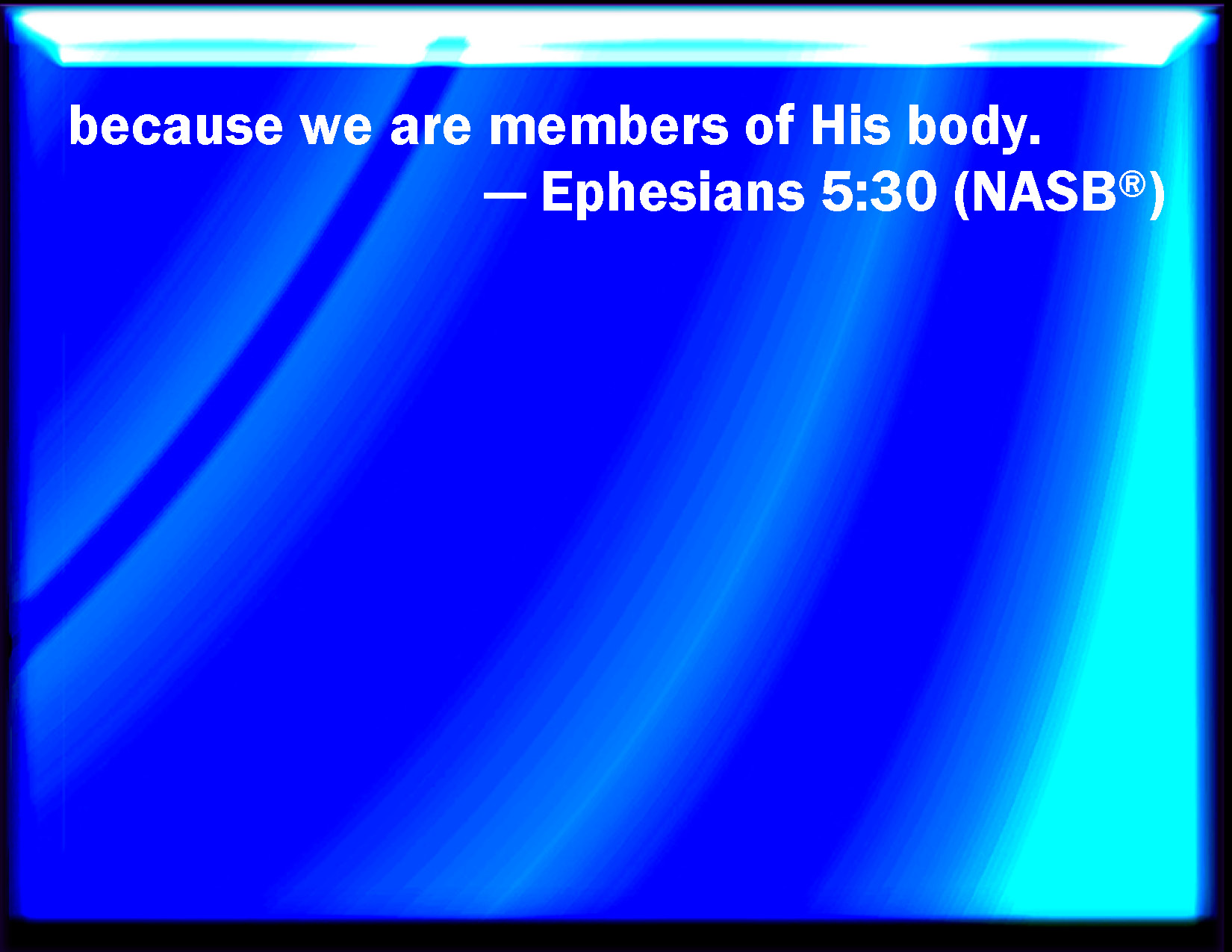 Bible Verse Slide Ephesians 5:30 For we are members of his body, of his flesh, and of his bones. KJV: For we are members of his body, of his flesh, and of his bones. DRB: Because we are members of his body, of his flesh, and of his bones. DBT: for we are members of his body; we are of his flesh, and of his bones. ERV: because we are members of his body. WBT: For we are members of his body, of his flesh, and of his bones. WEB: because we are members of his body, of his flesh and bones. YLT: because members we are of his body, of his flesh, and of his bones;Links Ephesians 5:30 NIV • Ephesians 5:30 NLT • Ephesians 5:30 ESV • Ephesians 5:30 NASB • Ephesians 5:30 KJV • Ephesians 5:30 Interlinear • Ephesians 5:30 Commentaries • Ephesians 5:30 Parallel Texts • Ephesians 5:30 Bible Apps • Ephesians 5:30 Parallel • Bible Hub |