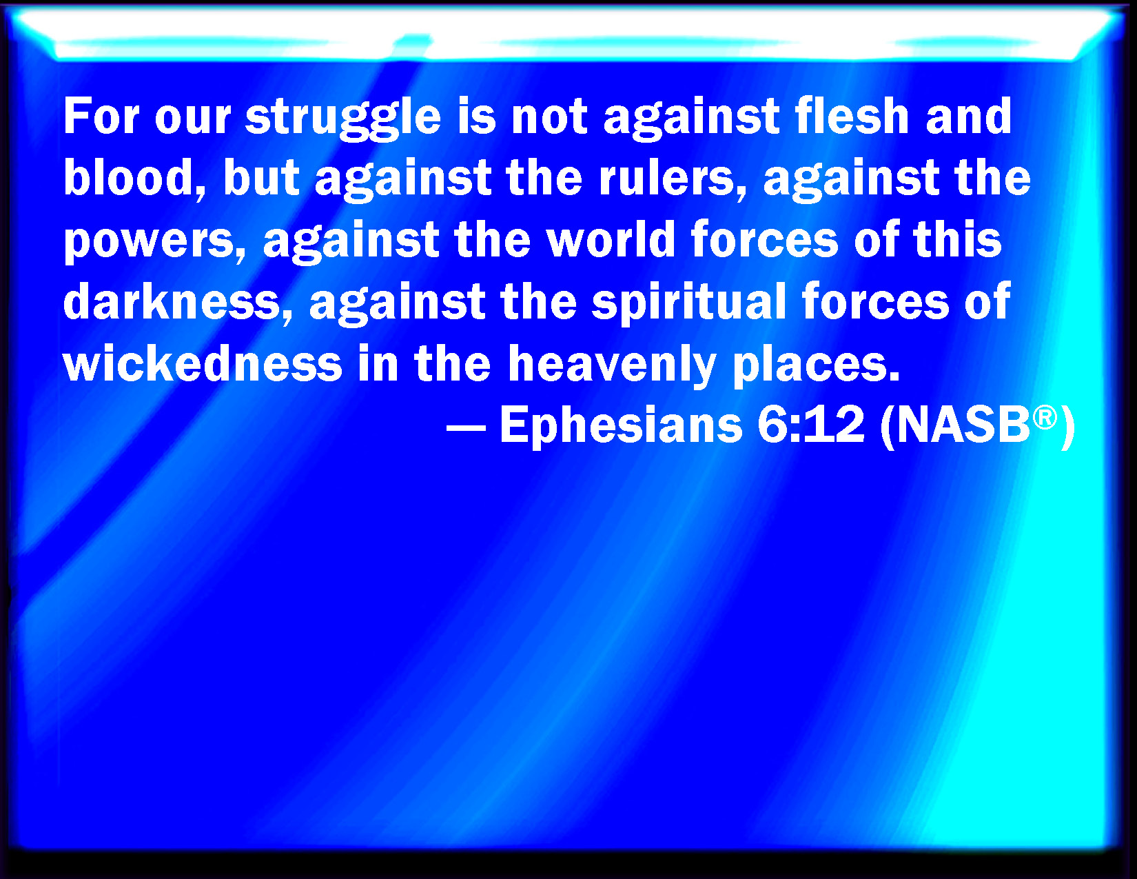 Bible Verse Slide Ephesians 6:12 For we wrestle not against flesh and blood, but against principalities, against powers, against the rulers of the darkness of this world, against spiritual wickedness in high places. KJV: For we wrestle not against flesh and blood, but against principalities, against powers, against the rulers of the darkness of this world, against spiritual wickedness in high places. DRB: For our wrestling is not against flesh and blood; but against principalities and power, against the rulers of the world of this darkness, against the spirits of wickedness in the high places. DBT: because our struggle is not against blood and flesh, but against principalities, against authorities, against the universal lords of this darkness, against spiritual power of wickedness in the heavenlies. ERV: For our wrestling is not against flesh and blood, but against the principalities, against the powers, against the world-rulers of this darkness, against the spiritual hosts of wickedness in the heavenly places. WBT: For we wrestle not against flesh and blood, but against principalities, against powers, against the rulers of the darkness of this world, against spiritual wickedness in high places. WEB: For our wrestling is not against flesh and blood, but against the principalities, against the powers, against the world's rulers of the darkness of this age, and against the spiritual forces of wickedness in the heavenly places. YLT: because we have not the wrestling with blood and flesh, but with the principalities, with the authorities, with the world-rulers of the darkness of this age, with the spiritual things of the evil in the heavenly places;Links Ephesians 6:12 NIV • Ephesians 6:12 NLT • Ephesians 6:12 ESV • Ephesians 6:12 NASB • Ephesians 6:12 KJV • Ephesians 6:12 Interlinear • Ephesians 6:12 Commentaries • Ephesians 6:12 Parallel Texts • Ephesians 6:12 Bible Apps • Ephesians 6:12 Parallel • Bible Hub |