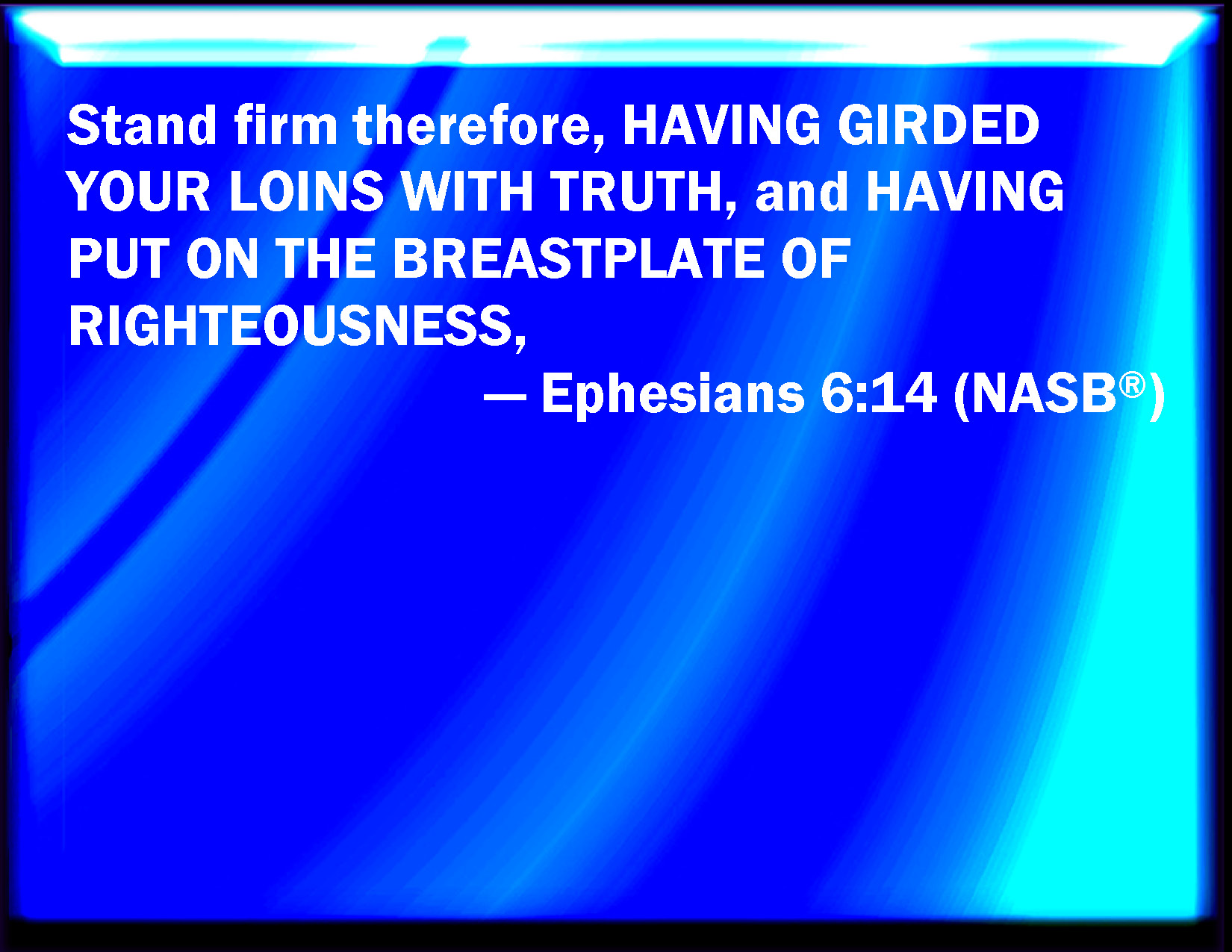 Bible Verse Slide Ephesians 6:14 Stand therefore, having your loins girt about with truth, and having on the breastplate of righteousness; KJV: Stand therefore, having your loins girt about with truth, and having on the breastplate of righteousness; DRB: Stand therefore, having your loins girt about with truth, and having on the breastplate of justice, DBT: Stand therefore, having girt about your loins with truth, and having put on the breastplate of righteousness, ERV: Stand therefore, having girded your loins with truth, and having put on the breastplate of righteousness, WBT: Stand therefore, having your loins girt about with truth, and having on the breast-plate of righteousness; WEB: Stand therefore, having the utility belt of truth buckled around your waist, and having put on the breastplate of righteousness, YLT: Stand, therefore, having your loins girt about in truth, and having put on the breastplate of the righteousness,Links Ephesians 6:14 NIV • Ephesians 6:14 NLT • Ephesians 6:14 ESV • Ephesians 6:14 NASB • Ephesians 6:14 KJV • Ephesians 6:14 Interlinear • Ephesians 6:14 Commentaries • Ephesians 6:14 Parallel Texts • Ephesians 6:14 Bible Apps • Ephesians 6:14 Parallel • Bible Hub |