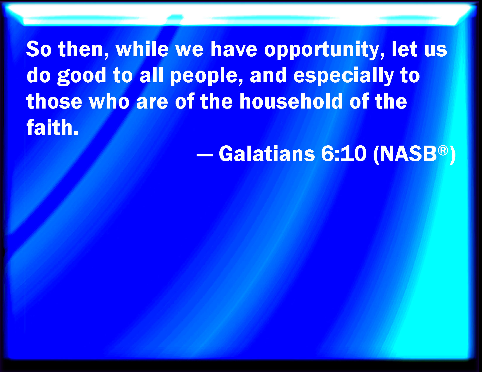 Bible Verse Slide Galatians 6:10 As we have therefore opportunity, let us do good to all men, especially to them who are of the household of faith. KJV: As we have therefore opportunity, let us do good unto all men, especially unto them who are of the household of faith. DRB: Therefore, whilst we have time, let us work good to all men, but especially to those who are of the household of the faith. DBT: So then, as we have occasion, let us do good towards all, and specially towards those of the household of faith. ERV: So then, as we have opportunity, let us work that which is good toward all men, and especially toward them that are of the household of the faith. WBT: As we have therefore opportunity, let us do good to all men, especially to them who are of the household of faith. WEB: So then, as we have opportunity, let's do what is good toward all men, and especially toward those who are of the household of the faith. YLT: therefore, then, as we have opportunity, may we work the good to all, and especially unto those of the household of the faith.Links Galatians 6:10 NIV • Galatians 6:10 NLT • Galatians 6:10 ESV • Galatians 6:10 NASB • Galatians 6:10 KJV • Galatians 6:10 Interlinear • Galatians 6:10 Commentaries • Galatians 6:10 Parallel Texts • Galatians 6:10 Bible Apps • Galatians 6:10 Parallel • Bible Hub |