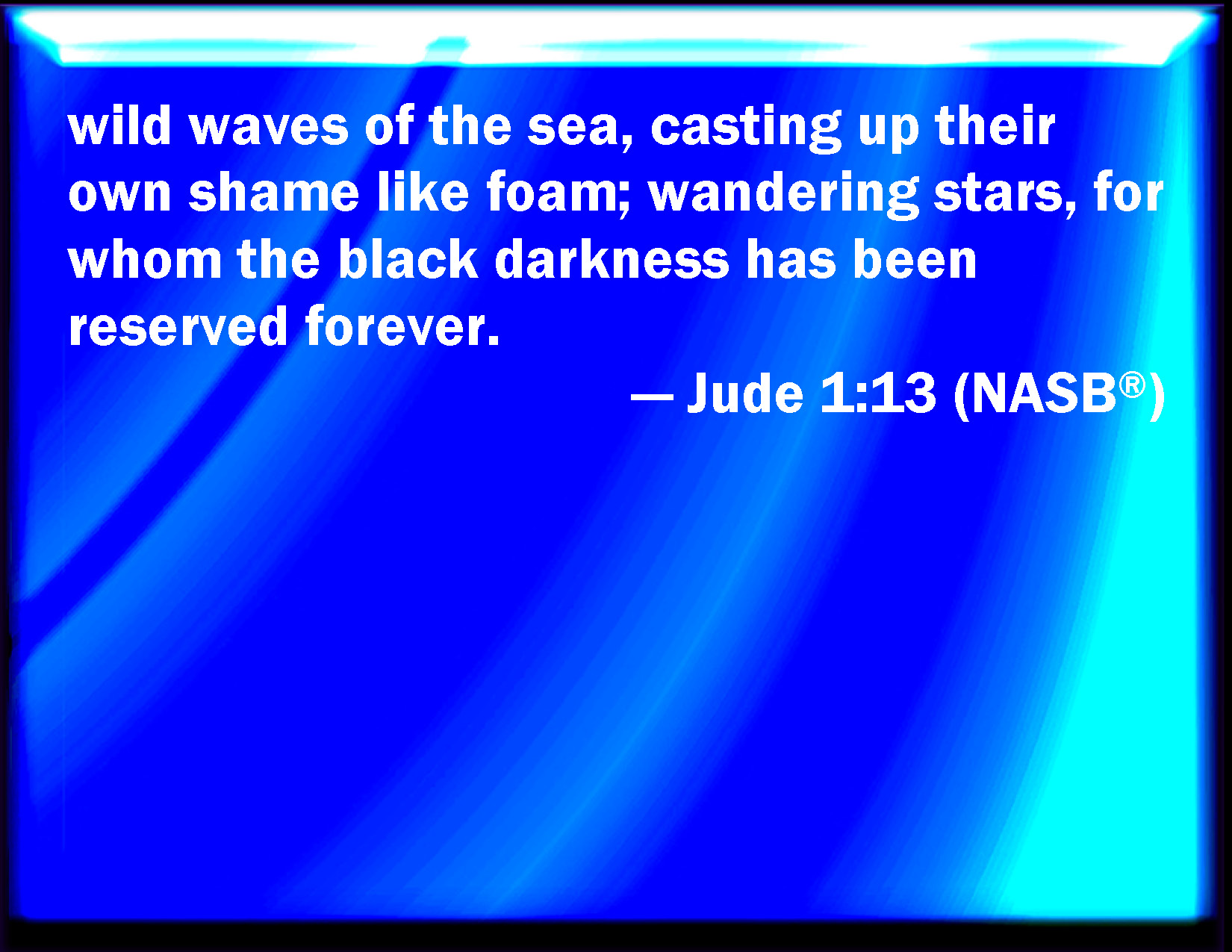 Bible Verse Slide Jude 1:13 Raging waves of the sea, foaming out their own shame; wandering stars, to whom is reserved the blackness of darkness for ever. KJV: Raging waves of the sea, foaming out their own shame; wandering stars, to whom is reserved the blackness of darkness for ever. DRB: Raging waves of the sea, foaming out their own confusion; wandering stars, to whom the storm of darkness is reserved for ever. DBT: raging waves of the sea, foaming out their own shames; wandering stars, to whom has been reserved the gloom of darkness for eternity. ERV: Wild waves of the sea, foaming out their own shame; wandering stars, for whom the blackness of darkness hath been reserved for ever. WBT: Raging waves of the sea, foaming out their own shame; wandering stars, to whom is reserved the blackness of darkness for ever. WEB: wild waves of the sea, foaming out their own shame; wandering stars, for whom the blackness of darkness has been reserved forever. YLT: wild waves of a sea, foaming out their own shames; stars going astray, to whom the gloom of the darkness to the age hath been kept.Links Jude 1:13 NIV • Jude 1:13 NLT • Jude 1:13 ESV • Jude 1:13 NASB • Jude 1:13 KJV • Jude 1:13 Interlinear • Jude 1:13 Commentaries • Jude 1:13 Parallel Texts • Jude 1:13 Bible Apps • Jude 1:13 Parallel • Bible Hub |