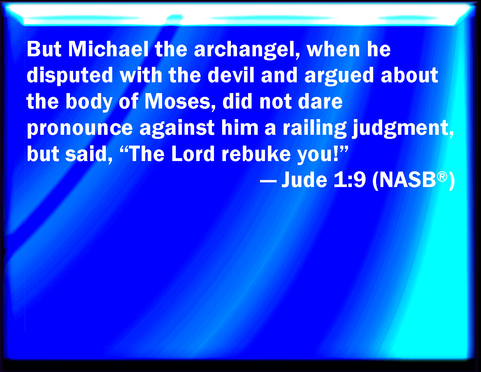 Bible Verse Slide Jude 1:9 Yet Michael the archangel, when contending with the devil he disputed about the body of Moses, dared not bring against him a railing accusation, but said, The Lord rebuke you. KJV: Yet Michael the archangel, when contending with the devil he disputed about the body of Moses, durst not bring against him a railing accusation, but said, The Lord rebuke thee. DRB: When Michael the archangel, disputing with the devil, contended about the body of Moses, he durst not bring against him the judgment of railing speech, but said: The Lord command thee. DBT: But Michael the archangel, when disputing with the devil he reasoned about the body of Moses, did not dare to bring a railing judgment against him, but said, The Lord rebuke thee. ERV: But Michael the archangel, when contending with the devil he disputed about the body of Moses, durst not bring against him a railing judgment, but said, The Lord rebuke thee. WBT: Yet Michael the archangel, when contending with the devil he disputed about the body of Moses, durst not bring against him a railing accusation, but said, The Lord rebuke thee. WEB: But Michael, the archangel, when contending with the devil and arguing about the body of Moses, dared not bring against him an abusive condemnation, but said, "May the Lord rebuke you!" YLT: yet Michael, the chief messenger, when, with the devil contending, he was disputing about the body of Moses, did not dare to bring up an evil-speaking judgment, but said, 'The Lord rebuke thee!'Links Jude 1:9 NIV • Jude 1:9 NLT • Jude 1:9 ESV • Jude 1:9 NASB • Jude 1:9 KJV • Jude 1:9 Interlinear • Jude 1:9 Commentaries • Jude 1:9 Parallel Texts • Jude 1:9 Bible Apps • Jude 1:9 Parallel • Bible Hub |