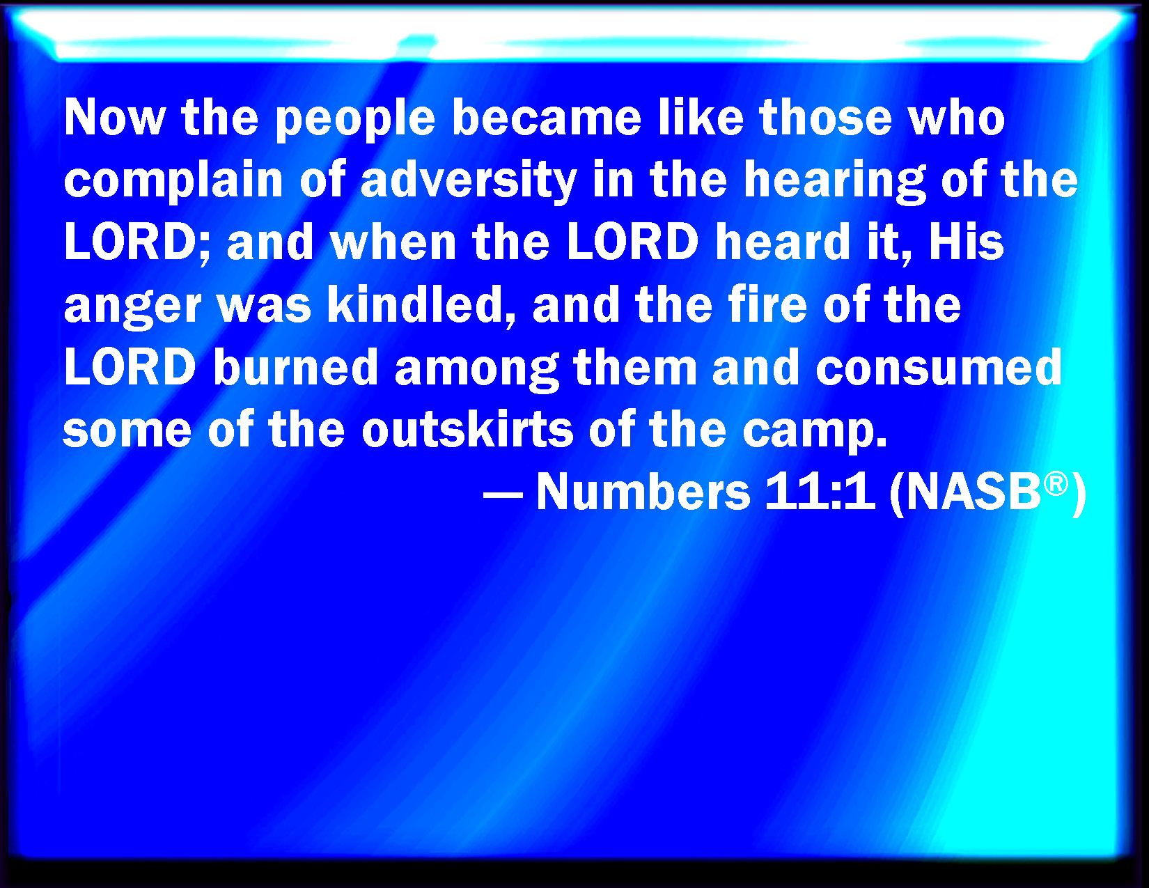 Bible Verse Slide Numbers 11:1 And when the people complained, it displeased the LORD: and the LORD heard it; and his anger was kindled; and the fire of the LORD burnt among them, and consumed them that were in the uttermost parts of the camp. KJV: And when the people complained, it displeased the LORD: and the LORD heard it; and his anger was kindled; and the fire of the LORD burnt among them, and consumed them that were in the uttermost parts of the camp. DRB: In the mean time there arose a murmuring of the people against the Lord, as it were repining at their fatigue. And when the Lord heard it he was angry. And the fire of the Lord being kindled against them, devoured them that were at the uttermost part of the camp. DBT: And it came to pass that when the people murmured, it was evil in the ears of Jehovah; and Jehovah heard it, and his anger was kindled, and the fire of Jehovah burned among them, and consumed some in the extremity of the camp. ERV: And the people were as murmurers, speaking evil in the ears of the LORD: and when the LORD heard it, his anger was kindled; and the fire of the LORD burnt among them, and devoured in the uttermost part of the camp. WBT: And when the people complained, it displeased the LORD; and the LORD heard it: and his anger was kindled; and the fire of the LORD burnt among them, and consumed them that were in the uttermost parts of the camp. WEB: The people were complaining in the ears of Yahweh. When Yahweh heard it, his anger was kindled; and Yahweh's fire burnt among them, and consumed some of the outskirts of the camp. YLT: And the people is evil, as those sighing habitually in the ears of Jehovah, and Jehovah heareth, and His anger burneth, and the fire of Jehovah burneth among them, and consumeth in the extremity of the camp.Links Numbers 11:1 NIV • Numbers 11:1 NLT • Numbers 11:1 ESV • Numbers 11:1 NASB • Numbers 11:1 KJV • Numbers 11:1 Interlinear • Numbers 11:1 Commentaries • Numbers 11:1 Parallel Texts • Numbers 11:1 Bible Apps • Numbers 11:1 Parallel • Bible Hub |