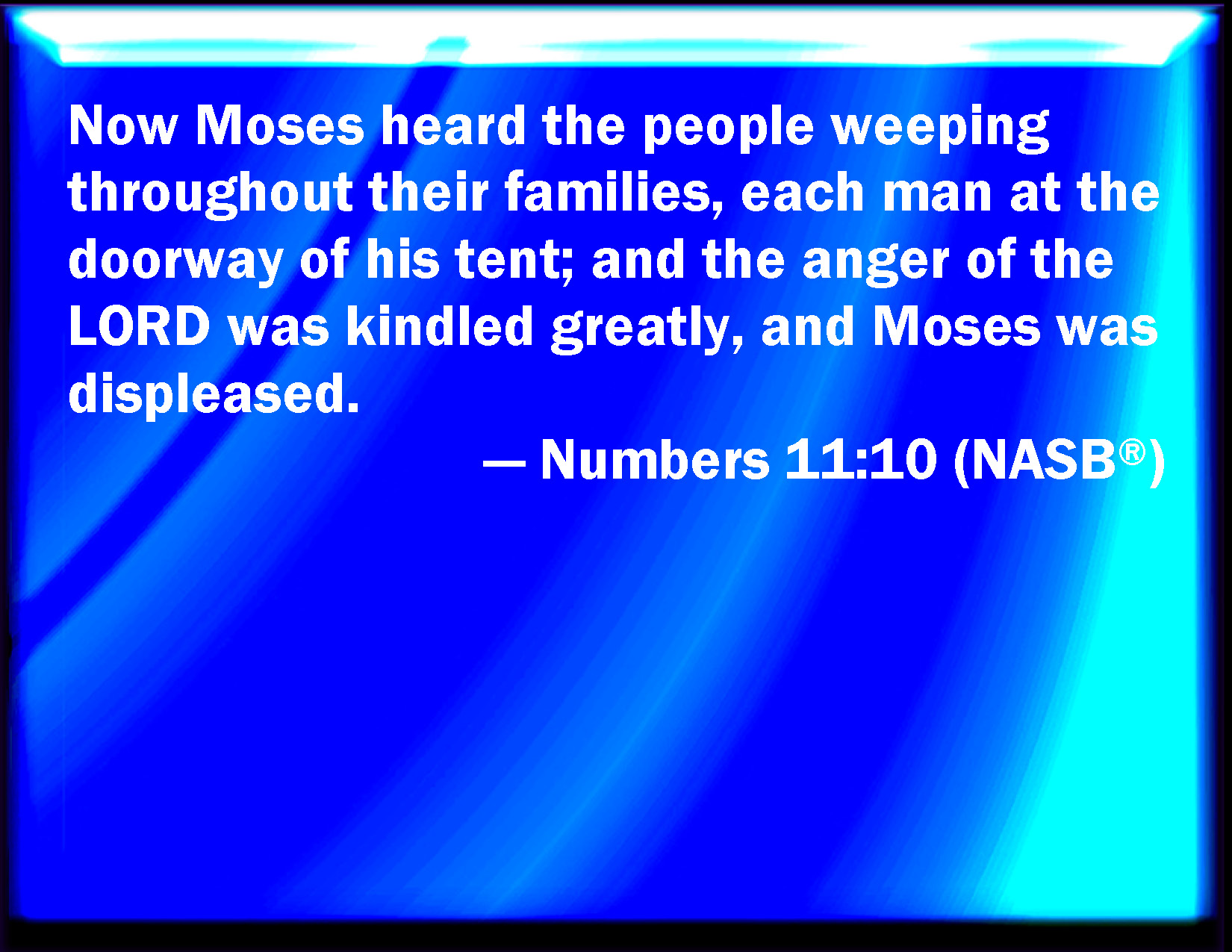 Bible Verse Slide Numbers 11:10 Then Moses heard the people weep throughout their families, every man in the door of his tent: and the anger of the LORD was kindled greatly; Moses also was displeased. KJV: Then Moses heard the people weep throughout their families, every man in the door of his tent: and the anger of the LORD was kindled greatly; Moses also was displeased. DRB: Now Moses heard the people weeping by their families, every one at the door of his tent. And the wrath of the Lord was exceedingly enkindled: to Moses also the thing seemed insupportable. DBT: And Moses heard the people weep throughout their families, every one at the entrance of his tent; and the anger of Jehovah was kindled greatly; it was also evil in the eyes of Moses. ERV: And Moses heard the people weeping throughout their families, every man at the door of his tent: and the anger of the LORD was kindled greatly; and Moses was displeased. WBT: Then Moses heard the people weeping throughout their families, every man in the door of his tent: and the anger of the LORD was kindled greatly: Moses also was displeased. WEB: Moses heard the people weeping throughout their families, every man at the door of his tent; and the anger of Yahweh was kindled greatly; and Moses was displeased. YLT: And Moses heareth the people weeping by its families, each at the opening of his tent, and the anger of Jehovah burneth exceedingly, and in the eyes of Moses it is evil.Links Numbers 11:10 NIV • Numbers 11:10 NLT • Numbers 11:10 ESV • Numbers 11:10 NASB • Numbers 11:10 KJV • Numbers 11:10 Interlinear • Numbers 11:10 Commentaries • Numbers 11:10 Parallel Texts • Numbers 11:10 Bible Apps • Numbers 11:10 Parallel • Bible Hub |