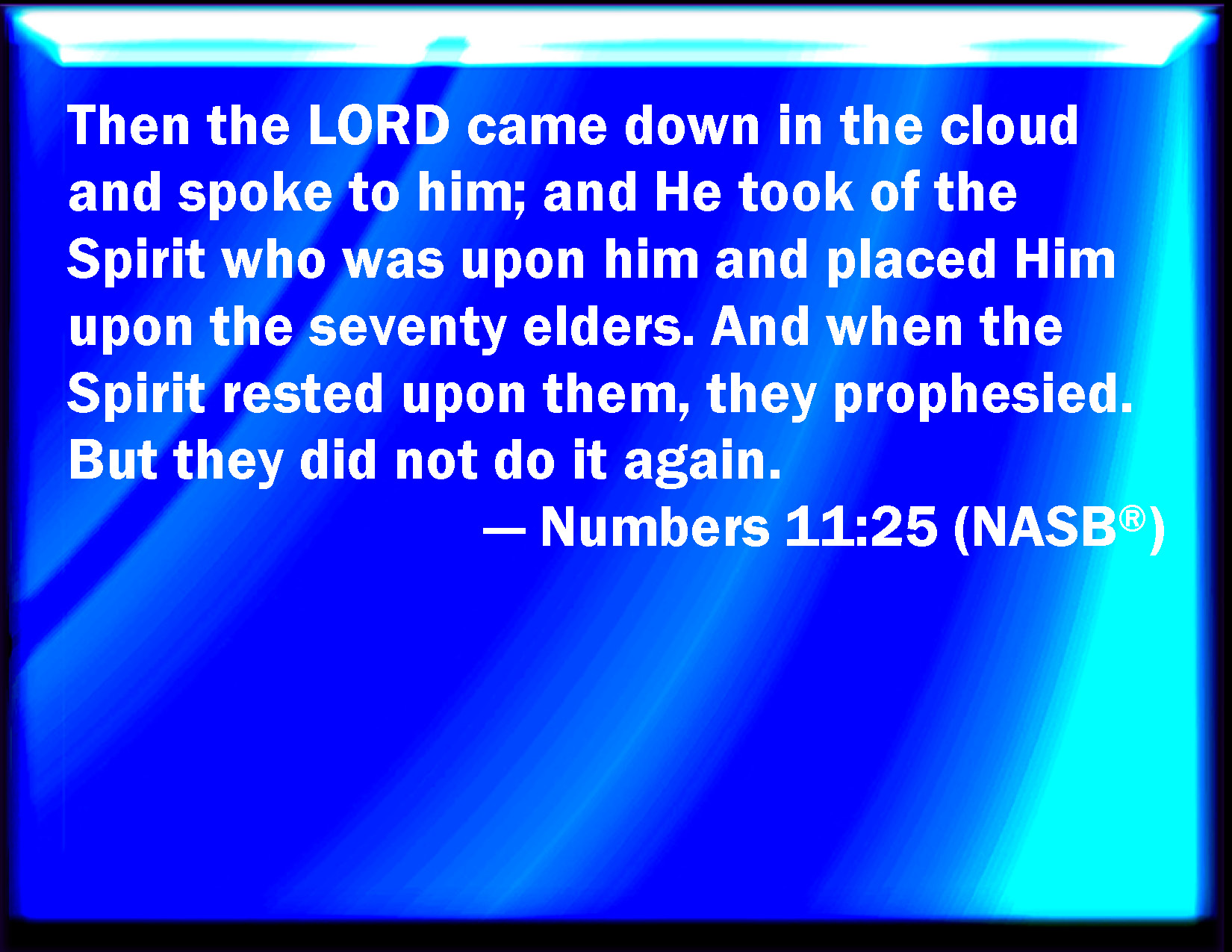 Bible Verse Slide Numbers 11:25 And the LORD came down in a cloud, and spoke to him, and took of the spirit that was on him, and gave it to the seventy elders: and it came to pass, that, when the spirit rested on them, they prophesied, and did not cease. KJV: And the LORD came down in a cloud, and spake unto him, and took of the spirit that was upon him, and gave it unto the seventy elders: and it came to pass, that, when the spirit rested upon them, they prophesied, and did not cease. DRB: And the Lord came down in a cloud, and spoke to him, taking away of the spirit that was in Moses, and giving to the seventy men. And when the spirit had rested on them they prophesied, nor did they cease afterwards. DBT: And Jehovah came down in a cloud, and spoke to him, and took of the Spirit that was upon him, and put it upon the seventy men, the elders; and it came to pass, that when the Spirit rested on them, they prophesied, but they did not repeat it. ERV: And the LORD came down in the cloud, and spake unto him, and took of the spirit that was upon him, and put it upon the seventy elders: and it came to pass, that, when the spirit rested upon them, they prophesied, but they did so no more. WBT: And the LORD came down in a cloud, and spoke to him, and took of the spirit that was upon him, and gave it to the seventy elders: and it came to pass, that when the spirit rested upon them; they prophesied, and did not cease. WEB: Yahweh came down in the cloud, and spoke to him, and took of the Spirit that was on him, and put it on the seventy elders: and it happened that when the Spirit rested on them, they prophesied, but they did so no more. YLT: and Jehovah cometh down in the cloud, and speaketh unto him, and keepeth back of the Spirit which is on him, and putteth on the seventy men of the elders; and it cometh to pass at the resting of the Spirit on them, that they prophesy, and do not cease.Links Numbers 11:25 NIV • Numbers 11:25 NLT • Numbers 11:25 ESV • Numbers 11:25 NASB • Numbers 11:25 KJV • Numbers 11:25 Interlinear • Numbers 11:25 Commentaries • Numbers 11:25 Parallel Texts • Numbers 11:25 Bible Apps • Numbers 11:25 Parallel • Bible Hub |