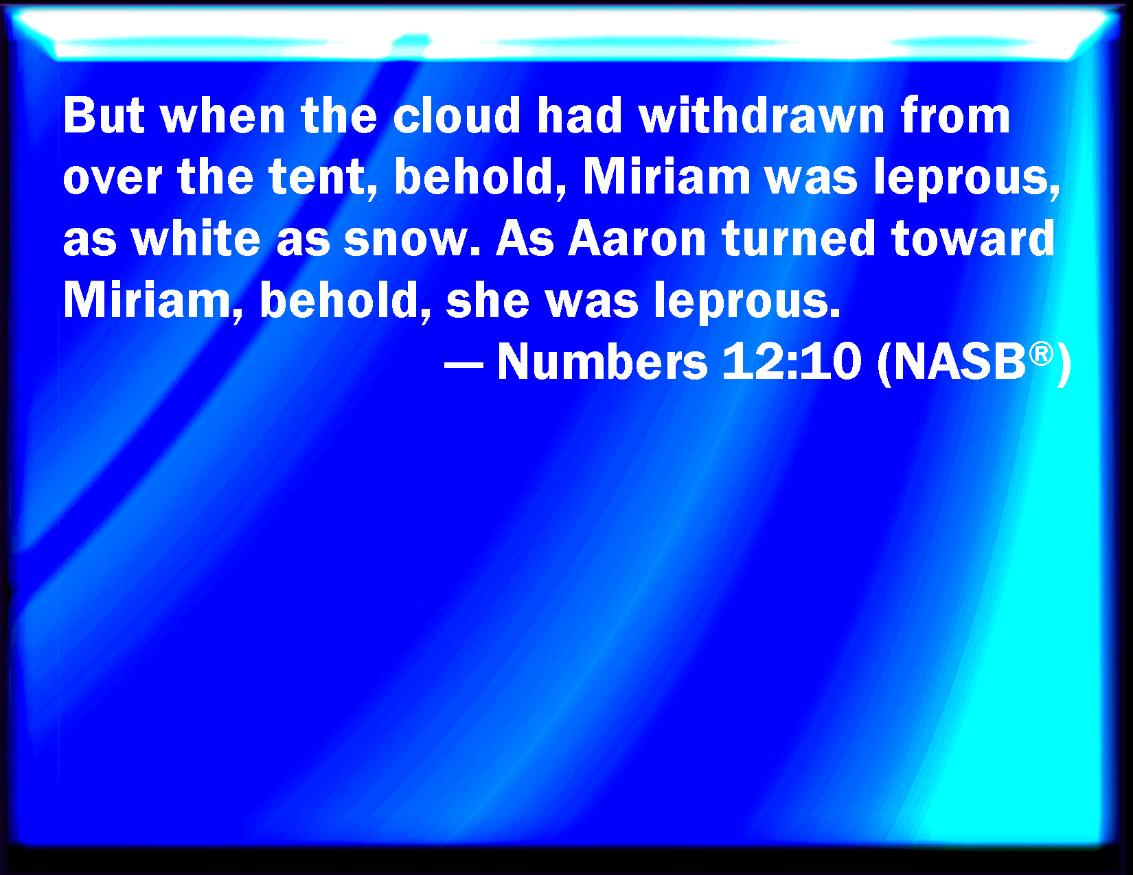 Bible Verse Slide Numbers 12:10 And the cloud departed from off the tabernacle; and, behold, Miriam became leprous, white as snow: and Aaron looked on Miriam, and, behold, she was leprous. KJV: And the cloud departed from off the tabernacle; and, behold, Miriam became leprous, white as snow: and Aaron looked upon Miriam, and, behold, she was leprous. DRB: The cloud also that was over the tabernacle departed: and behold Mary appeared white as snow with a leprosy. And when Aaron had looked on her, and saw her all covered with leprosy, DBT: and the cloud departed from off the tent. And behold, Miriam was leprous as snow; and Aaron turned toward Miriam, and behold, she was leprous. ERV: And the cloud removed from over the Tent; and, behold, Miriam was leprous, as white as snow: and Aaron looked upon Miriam, and, behold, she was leprous. WBT: And the cloud departed from off the tabernacle; and behold, Miriam became leprous, white as snow: and Aaron looked upon Miriam, and behold, she was leprous. WEB: The cloud departed from over the Tent; and behold, Miriam was leprous, as white as snow. Aaron looked at Miriam, and behold, she was leprous. YLT: and the cloud hath turned aside from off the tent, and lo, Miriam is leprous as snow; and Aaron turneth unto Miriam, and lo, leprous!Links Numbers 12:10 NIV • Numbers 12:10 NLT • Numbers 12:10 ESV • Numbers 12:10 NASB • Numbers 12:10 KJV • Numbers 12:10 Interlinear • Numbers 12:10 Commentaries • Numbers 12:10 Parallel Texts • Numbers 12:10 Bible Apps • Numbers 12:10 Parallel • Bible Hub |