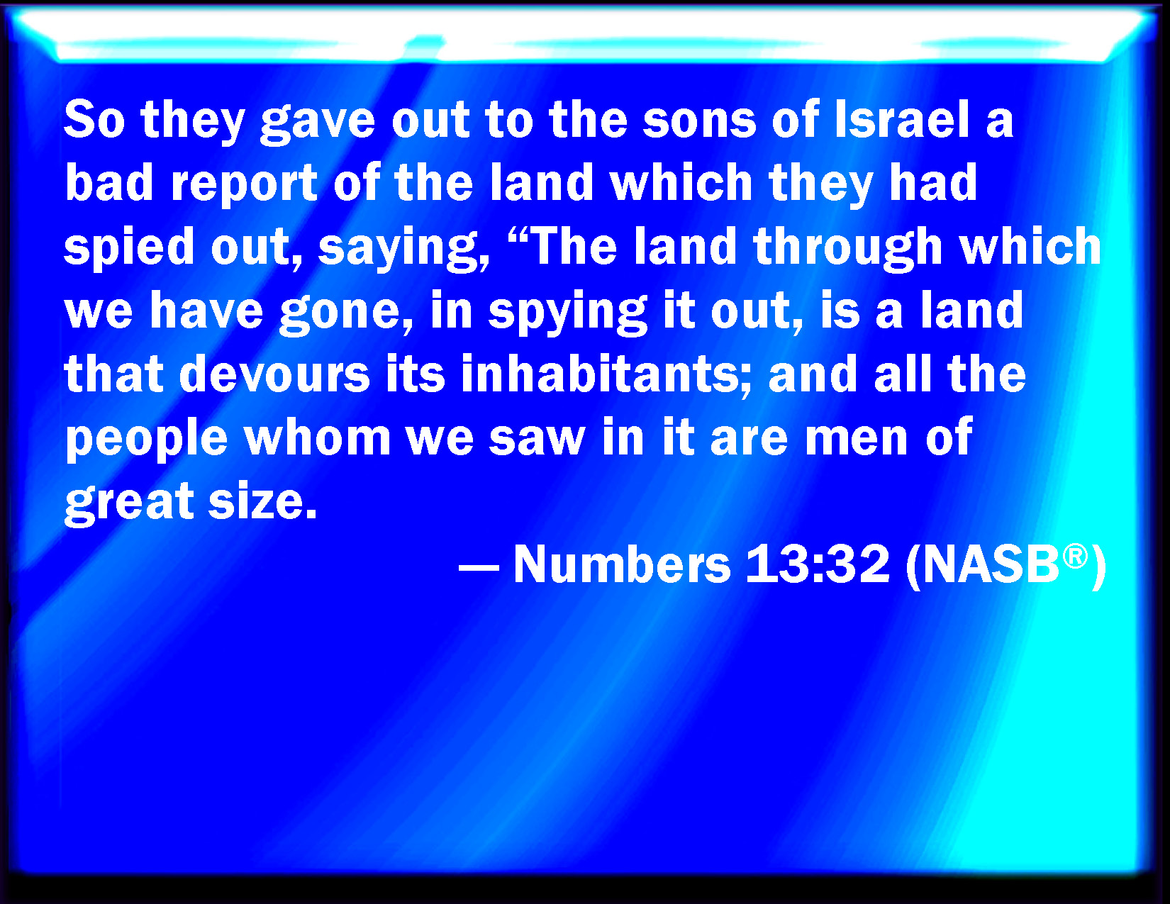 Bible Verse Slide Numbers 13:32 And they brought up an evil report of the land which they had searched to the children of Israel, saying, The land, through which we have gone to search it, is a land that eats up the inhabitants thereof; and all the people that we saw in it are men of a great stature. KJV: And they brought up an evil report of the land which they had searched unto the children of Israel, saying, The land, through which we have gone to search it, is a land that eateth up the inhabitants thereof; and all the people that we saw in it are men of a great stature. DRB: And they spoke ill of the land, which they had viewed, before the children of Israel, saying: The land which we have viewed, devoureth its inhabitants: the people, that we beheld, are of a tall stature. DBT: And they brought to the children of Israel an evil report of the land which they had searched out, saying, The land, which we have passed through to search it out, is a land that eateth up its inhabitants; and all the people that we have seen in it are men of great stature; ERV: And they brought up an evil report of the land which they had spied out unto the children of Israel, saying, The land, through which we have gone to spy it out, is a land that eateth up the inhabitants thereof; and all the people that we saw in it are men of great stature. WBT: And they brought an evil report of the land which they had searched to the children of Israel, saying, The land through which we have passed to search it, is a land that eateth up its inhabitants; and all the people that we saw in it, are men of a great stature. WEB: They brought up an evil report of the land which they had spied out to the children of Israel, saying, "The land, through which we have gone to spy it out, is a land that eats up its inhabitants; and all the people who we saw in it are men of great stature. YLT: and they bring out an evil account of the land which they have spied unto the sons of Israel, saying, 'The land into which we passed over to spy it, is a land eating up its inhabitants; and all the people whom we saw in its midst are men of stature;Links Numbers 13:32 NIV • Numbers 13:32 NLT • Numbers 13:32 ESV • Numbers 13:32 NASB • Numbers 13:32 KJV • Numbers 13:32 Interlinear • Numbers 13:32 Commentaries • Numbers 13:32 Parallel Texts • Numbers 13:32 Bible Apps • Numbers 13:32 Parallel • Bible Hub |