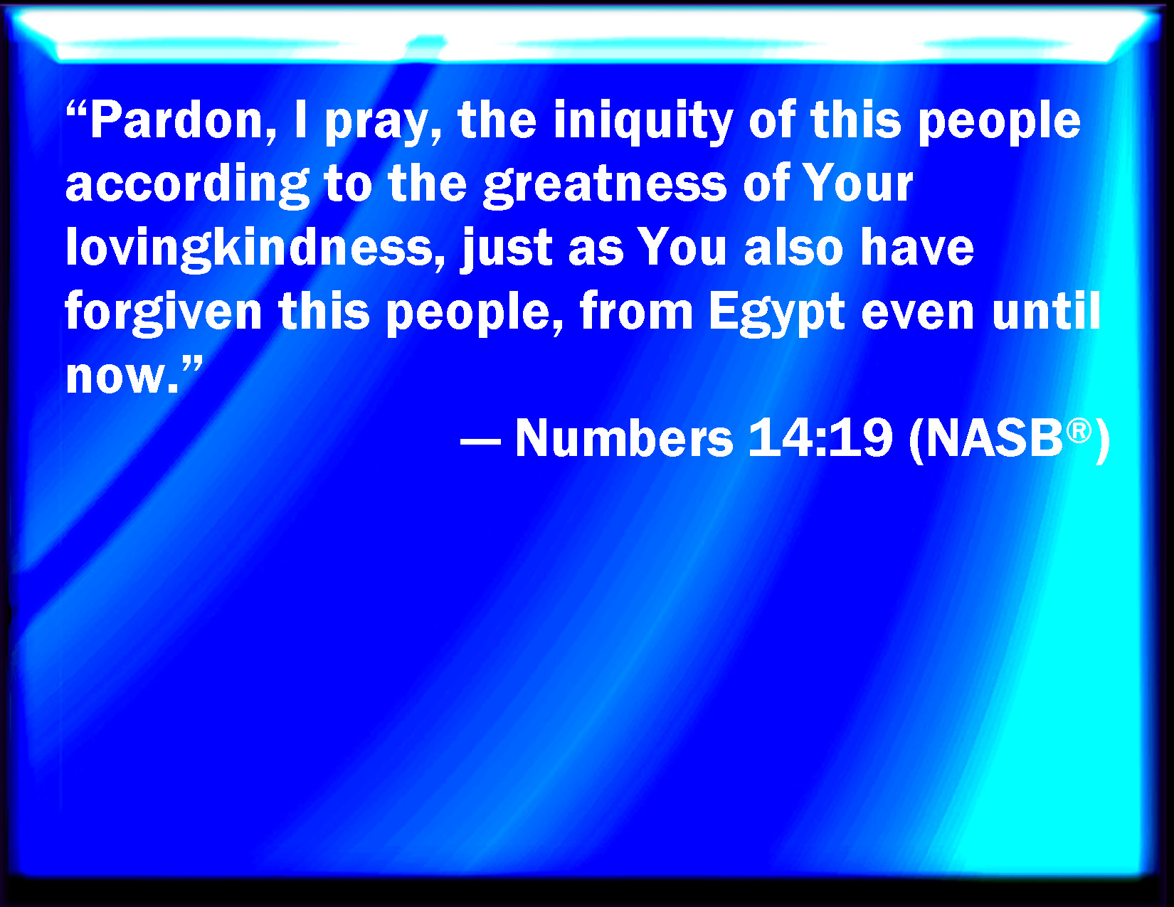 Bible Verse Slide Numbers 14:19 Pardon, I beseech you, the iniquity of this people according to the greatness of your mercy, and as you have forgiven this people, from Egypt even until now. KJV: Pardon, I beseech thee, the iniquity of this people according unto the greatness of thy mercy, and as thou hast forgiven this people, from Egypt even until now. DRB: Forgive, I beseech thee, the sins of this people, according to the greatness of thy mercy, as thou hast been merciful to them from their going out of Egypt unto this place. DBT: Pardon, I beseech thee, the iniquity of this people according to the greatness of thy loving-kindness, and as thou hast forgiven this people, from Egypt even until now. ERV: Pardon, I pray thee, the iniquity of this people according unto the greatness of thy mercy, and according as thou hast forgiven this people, from Egypt even until now. WBT: Pardon, I beseech thee, the iniquity of this people according to the greatness of thy mercy, and as thou hast forgiven this people, from Egypt, even until now. WEB: Please pardon the iniquity of this people according to the greatness of your loving kindness, and according as you have forgiven this people, from Egypt even until now." YLT: forgive, I pray Thee, the iniquity of this people, according to the greatness of Thy kindness, and as Thou hast borne with this people from Egypt, even until now.'Links Numbers 14:19 NIV • Numbers 14:19 NLT • Numbers 14:19 ESV • Numbers 14:19 NASB • Numbers 14:19 KJV • Numbers 14:19 Interlinear • Numbers 14:19 Commentaries • Numbers 14:19 Parallel Texts • Numbers 14:19 Bible Apps • Numbers 14:19 Parallel • Bible Hub |