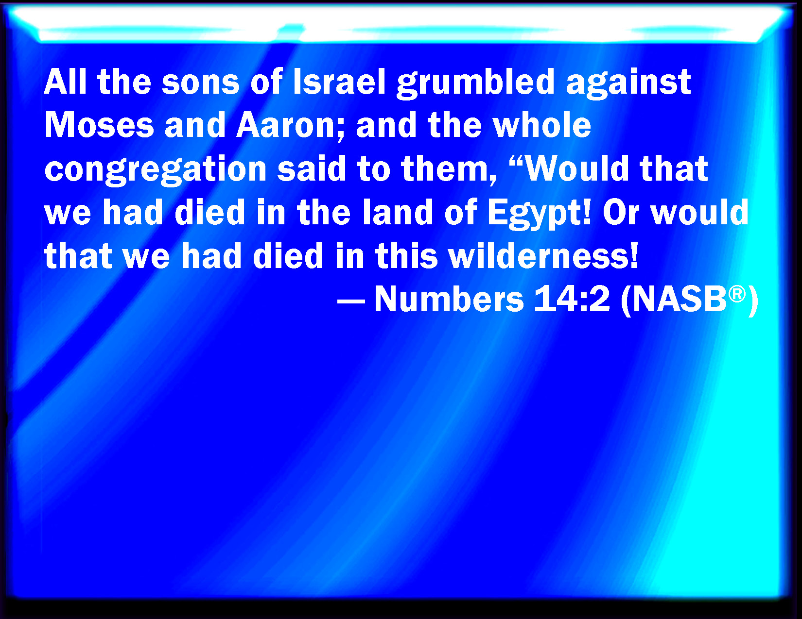 Bible Verse Slide Numbers 14:2 And all the children of Israel murmured against Moses and against Aaron: and the whole congregation said to them, Would God that we had died in the land of Egypt! or would God we had died in this wilderness! KJV: And all the children of Israel murmured against Moses and against Aaron: and the whole congregation said unto them, Would God that we had died in the land of Egypt! or would God we had died in this wilderness! DRB: And all the children of Israel murmured against Moses and Aaron, saying: DBT: And all the children of Israel murmured against Moses and against Aaron; and the whole assembly said to them, Would that we had died in the land of Egypt! or in this wilderness would that we had died! ERV: And all the children of Israel murmured against Moses and against Aaron: and the whole congregation said unto them, Would God that we had died in the land of Egypt! or would God we had died in this wilderness! WBT: And all the children of Israel murmured against Moses and against Aaron: and the whole congregation said to them, O that we had died in the land of Egypt! or O that we had died in this wilderness! WEB: All the children of Israel murmured against Moses and against Aaron: and the whole congregation said to them, "Would that we had died in the land of Egypt! or would that we had died in this wilderness! YLT: and all the sons of Israel murmur against Moses, and against Aaron, and all the company say unto them, 'O that we had died in the land of Egypt, or in this wilderness, O that we had died!Links Numbers 14:2 NIV • Numbers 14:2 NLT • Numbers 14:2 ESV • Numbers 14:2 NASB • Numbers 14:2 KJV • Numbers 14:2 Interlinear • Numbers 14:2 Commentaries • Numbers 14:2 Parallel Texts • Numbers 14:2 Bible Apps • Numbers 14:2 Parallel • Bible Hub |