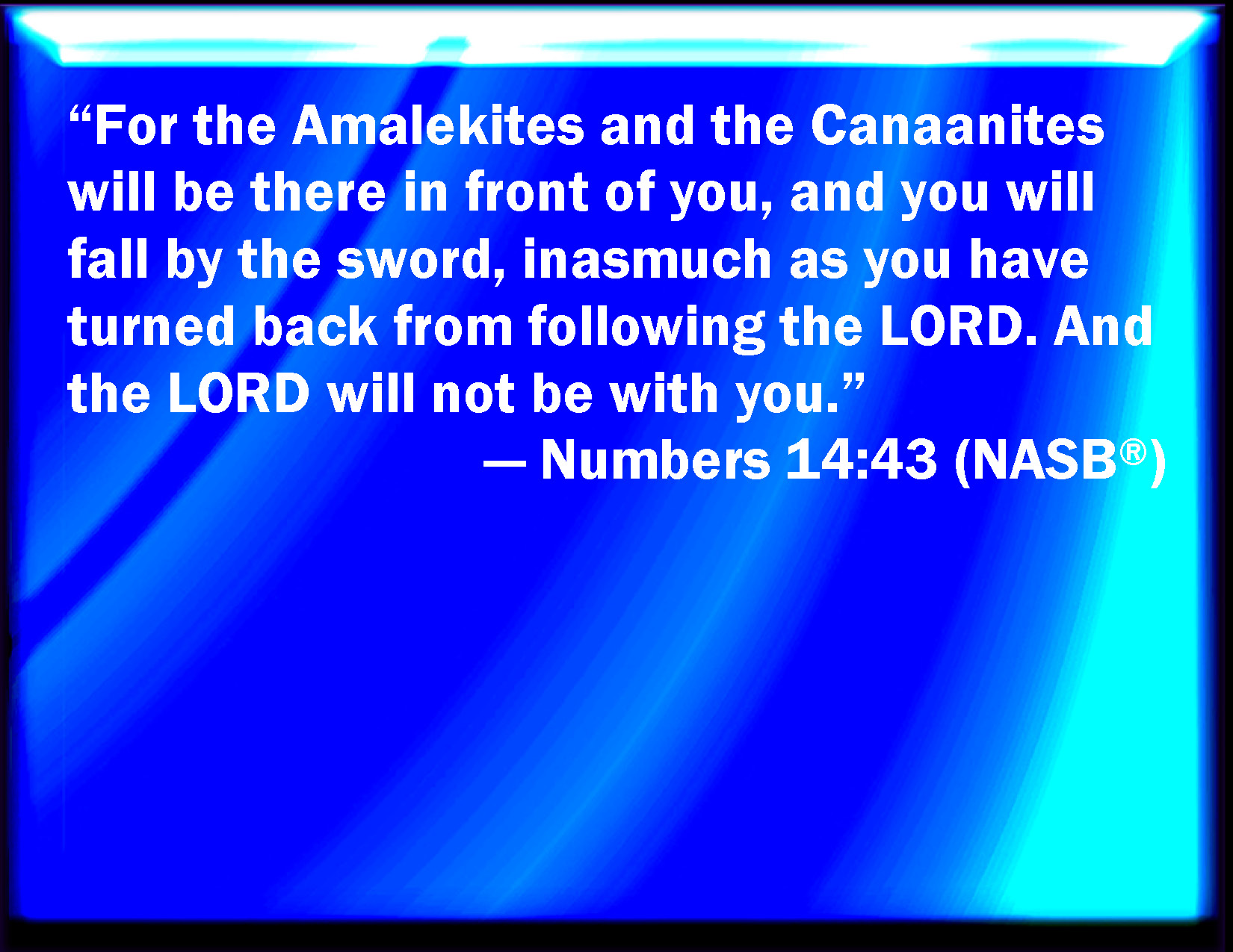 Bible Verse Slide Numbers 14:43 For the Amalekites and the Canaanites are there before you, and you shall fall by the sword: because you are turned away from the LORD, therefore the LORD will not be with you. KJV: For the Amalekites and the Canaanites are there before you, and ye shall fall by the sword: because ye are turned away from the LORD, therefore the LORD will not be with you. DRB: The Amalecite and the Chanaanite are before you, and by their sword you shall fall, because you would not consent to the Lord, neither will the Lord be with you. DBT: for the Amalekites and the Canaanites are there before you, and ye shall fall by the sword; for as ye have turned away from Jehovah, Jehovah will not be with you. ERV: For there the Amalekite and the Canaanite are before you, and ye shall fall by the sword: because ye are turned back from following the LORD, therefore the LORD will not be with you. WBT: For the Amalekites and the Canaanites are there before you, and ye shall fall by the sword: because ye are turned away from the LORD, therefore the LORD will not be with you. WEB: For there the Amalekite and the Canaanite are before you, and you shall fall by the sword: because you are turned back from following Yahweh, therefore Yahweh will not be with you." YLT: for the Amalekite and the Canaanite are there before you, and ye have fallen by the sword, because that ye have turned back from after Jehovah, and Jehovah is not with you.'Links Numbers 14:43 NIV • Numbers 14:43 NLT • Numbers 14:43 ESV • Numbers 14:43 NASB • Numbers 14:43 KJV • Numbers 14:43 Interlinear • Numbers 14:43 Commentaries • Numbers 14:43 Parallel Texts • Numbers 14:43 Bible Apps • Numbers 14:43 Parallel • Bible Hub |