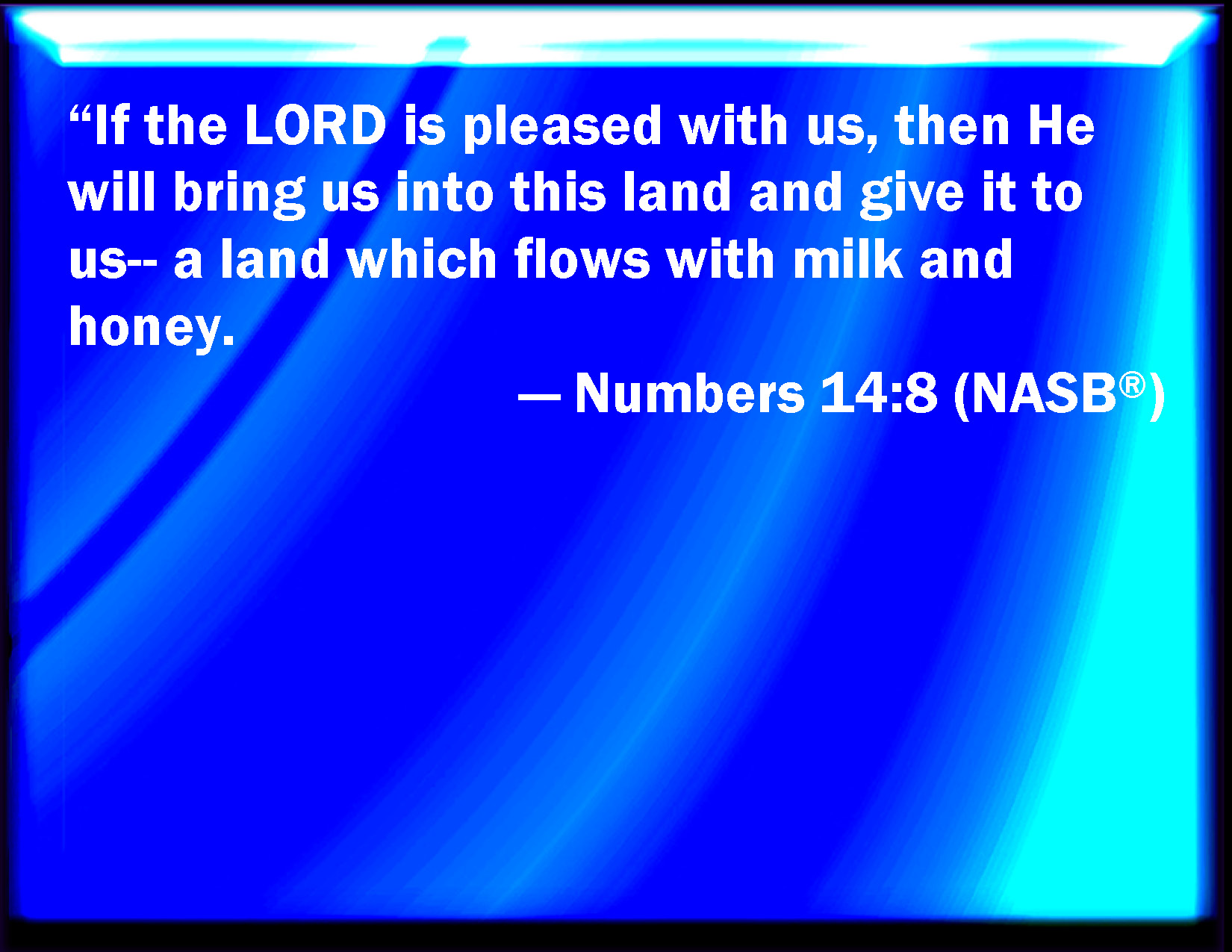 Bible Verse Slide Numbers 14:8 If the LORD delight in us, then he will bring us into this land, and give it us; a land which flows with milk and honey. KJV: If the LORD delight in us, then he will bring us into this land, and give it us; a land which floweth with milk and honey. DRB: If the Lord be favourable, he will bring us into it, and give us a land flowing with milk and honey. DBT: If Jehovah delight in us, he will bring us into this land, and give it us, a land that flows with milk and honey; ERV: If the LORD delight in us, then he will bring us into this land, and give it unto us; a land which floweth with milk and honey. WBT: If the LORD delighteth in us, then he will bring us into this land, and give it to us; a land which floweth with milk and honey. WEB: If Yahweh delights in us, then he will bring us into this land, and give it to us; a land which flows with milk and honey. YLT: if Jehovah hath delighted in us, then He hath brought us in unto this land, and hath given it to us, a land which is flowing with milk and honey;Links Numbers 14:8 NIV • Numbers 14:8 NLT • Numbers 14:8 ESV • Numbers 14:8 NASB • Numbers 14:8 KJV • Numbers 14:8 Interlinear • Numbers 14:8 Commentaries • Numbers 14:8 Parallel Texts • Numbers 14:8 Bible Apps • Numbers 14:8 Parallel • Bible Hub |