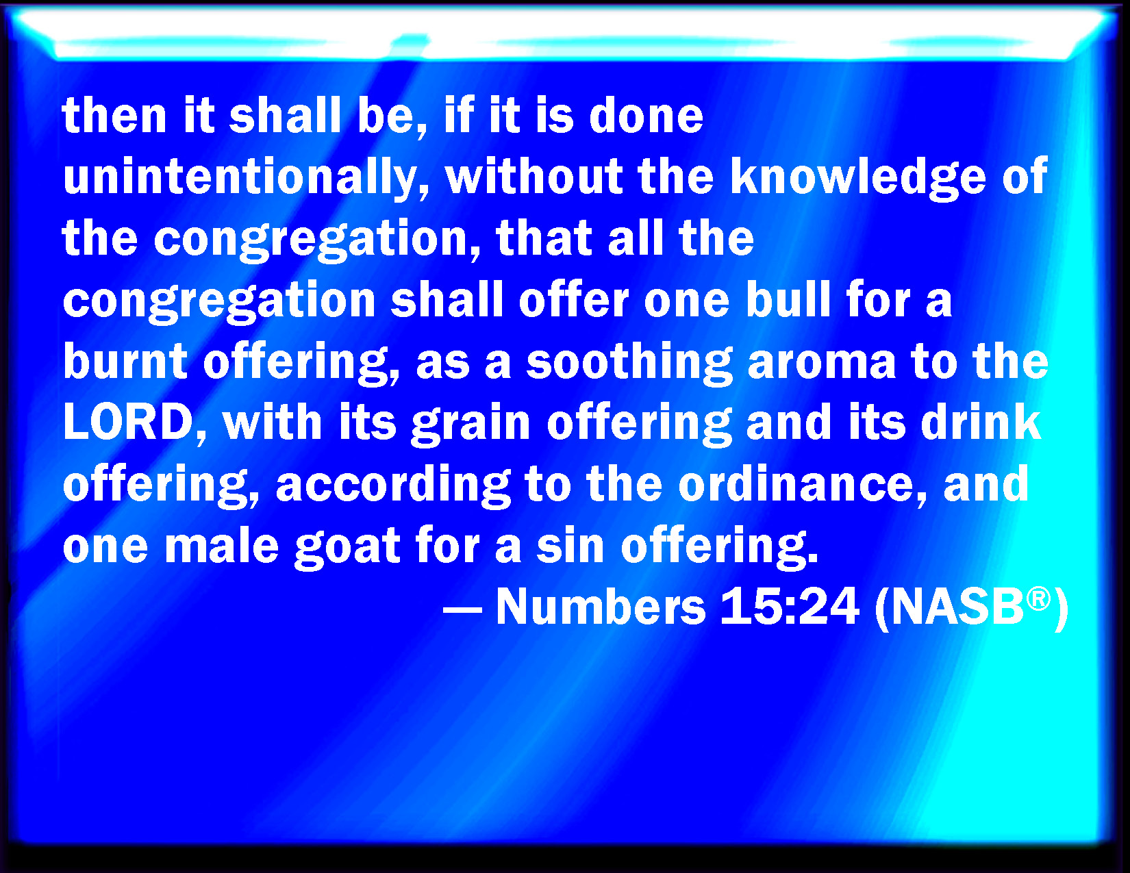 Bible Verse Slide Numbers 15:24 Then it shall be, if ought be committed by ignorance without the knowledge of the congregation, that all the congregation shall offer one young bullock for a burnt offering, for a sweet smell to the LORD, with his meat offering, and his drink offering, according to the manner, and one kid of the goats for a sin offering. KJV: Then it shall be, if ought be committed by ignorance without the knowledge of the congregation, that all the congregation shall offer one young bullock for a burnt offering, for a sweet savour unto the LORD, with his meat offering, and his drink offering, according to the manner, and one kid of the goats for a sin offering. DRB: And the multitude have forgotten to do it: they shall offer a calf out of the herd, a holocaust for a most sweet savour to the Lord, and the sacrifice and libations thereof, as the ceremonies require, and a buck goat for sin: DBT: then it shall be, if ought be committed by inadvertence hid from the eyes of the assembly, that the whole assembly shall offer one young bullock for a burnt-offering, for a sweet odour to Jehovah, and its oblation and its drink-offering according to the ordinance, and one buck of the goats for a sin-offering. ERV: then it shall be, if it be done unwittingly, without the knowledge of the congregation, that all the congregation shall offer one young bullock for a burnt offering, for a sweet savour unto the LORD, with the meal offering thereof, and the drink offering thereof, according to the ordinance, and one he-goat for a sin offering. WBT: Then it shall be, if aught shall be committed by ignorance without the knowledge of the congregation, that all the congregation shall offer one young bullock for a burnt-offering, for a sweet savor to the LORD, with his meat-offering, and his drink-offering, according to the manner, and one kid of the goats for a sin-offering. WEB: then it shall be, if it be done unwittingly, without the knowledge of the congregation, that all the congregation shall offer one young bull for a burnt offering, for a pleasant aroma to Yahweh, with the meal offering of it, and the drink offering of it, according to the ordinance, and one male goat for a sin offering. YLT: then it hath been, if from the eyes of the company it hath been done in ignorance, that all the company have prepared one bullock, a son of the herd, for a burnt-offering, for sweet fragrance to Jehovah, and its present, and its libation, according to the ordinance, and one kid of the goats for a sin-offering.Links Numbers 15:24 NIV • Numbers 15:24 NLT • Numbers 15:24 ESV • Numbers 15:24 NASB • Numbers 15:24 KJV • Numbers 15:24 Interlinear • Numbers 15:24 Commentaries • Numbers 15:24 Parallel Texts • Numbers 15:24 Bible Apps • Numbers 15:24 Parallel • Bible Hub |