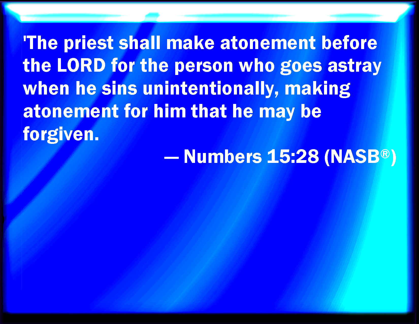 Bible Verse Slide Numbers 15:28 And the priest shall make an atonement for the soul that sins ignorantly, when he sins by ignorance before the LORD, to make an atonement for him; and it shall be forgiven him. KJV: And the priest shall make an atonement for the soul that sinneth ignorantly, when he sinneth by ignorance before the LORD, to make an atonement for him; and it shall be forgiven him. DRB: And the priest shall pray for him, because he sinned ignorantly before the Lord: and he shall obtain his pardon, and it shall be forgiven him. DBT: And the priest shall make atonement for the soul that hath done inadvertently, when he sinneth by inadvertence before Jehovah, to make atonement for him; and it shall be forgiven him. ERV: And the priest shall make atonement for the soul that erreth, when he sinneth unwittingly, before the LORD, to make atonement for him; and he shall be forgiven. WBT: And the priest shall make an atonement for the soul that sinneth ignorantly, when he sinneth by ignorance before the LORD, to make an atonement for him; and it shall be forgiven him. WEB: The priest shall make atonement for the soul who errs, when he sins unwittingly, before Yahweh, to make atonement for him; and he shall be forgiven. YLT: and the priest hath made atonement for the person who is erring, in his sinning in ignorance before Jehovah, by making atonement for him, and it hath been forgiven him;Links Numbers 15:28 NIV • Numbers 15:28 NLT • Numbers 15:28 ESV • Numbers 15:28 NASB • Numbers 15:28 KJV • Numbers 15:28 Interlinear • Numbers 15:28 Commentaries • Numbers 15:28 Parallel Texts • Numbers 15:28 Bible Apps • Numbers 15:28 Parallel • Bible Hub |