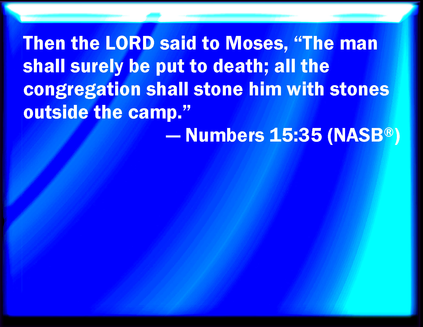 Bible Verse Slide Numbers 15:35 And the LORD said to Moses, The man shall be surely put to death: all the congregation shall stone him with stones without the camp. KJV: And the LORD said unto Moses, The man shall be surely put to death: all the congregation shall stone him with stones without the camp. DRB: And the Lord said to Moses: Let that man die, let all the multitude stone him without the camp. DBT: And Jehovah said to Moses, The man shall certainly be put to death: the whole assembly shall stone him with stones outside the camp. ERV: And the LORD said unto Moses, The man shall surely be put to death: all the congregation shall stone him with stones without the camp. WBT: And the LORD said to Moses, The man shall surely be put to death: all the congregation shall stone him with stones without the camp. WEB: Yahweh said to Moses, "The man shall surely be put to death: all the congregation shall stone him with stones outside of the camp." YLT: And Jehovah saith unto Moses, 'The man is certainly put to death, all the company stoning him with stones, at the outside of the camp.'Links Numbers 15:35 NIV • Numbers 15:35 NLT • Numbers 15:35 ESV • Numbers 15:35 NASB • Numbers 15:35 KJV • Numbers 15:35 Interlinear • Numbers 15:35 Commentaries • Numbers 15:35 Parallel Texts • Numbers 15:35 Bible Apps • Numbers 15:35 Parallel • Bible Hub |