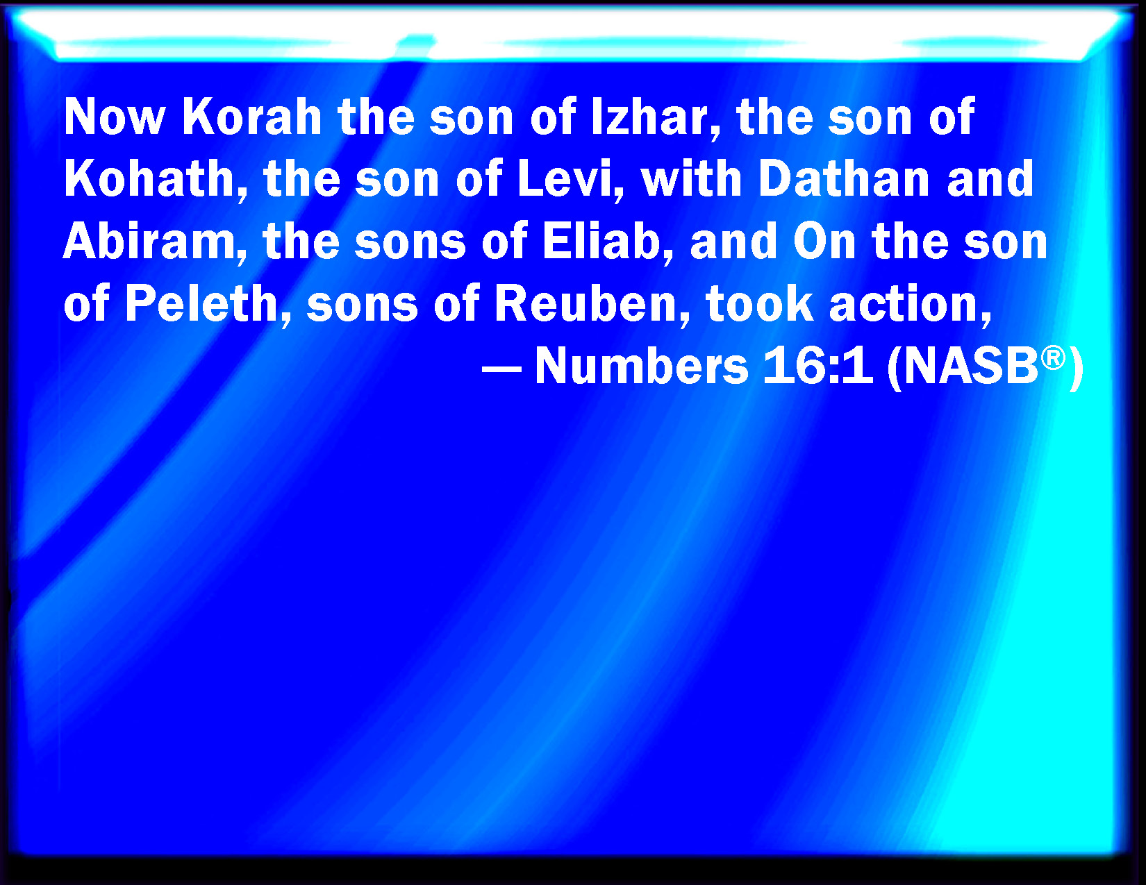Bible Verse Slide Numbers 16:1 Now Korah, the son of Izhar, the son of Kohath, the son of Levi, and Dathan and Abiram, the sons of Eliab, and On, the son of Peleth, sons of Reuben, took men: KJV: Now Korah, the son of Izhar, the son of Kohath, the son of Levi, and Dathan and Abiram, the sons of Eliab, and On, the son of Peleth, sons of Reuben, took men: DRB: And behold Core the son of Isaar, the son of Caath, the son of Levi, and Dathan and Abiron the sons of Eliab, and Hon the son of Pheleth of the children of Ruben, DBT: And Korah, the son of Izhar, the son of Kohath, the son of Levi, made bold, and with him Dathan and Abiram, the sons of Eliab, and On, the son of Peleth, the sons of Reuben; ERV: Now Korah, the son of Izhar, the son of Kohath, the son of Levi, with Dathan and Abiram, the sons of Eliab, and On, the son of Peleth, sons of Reuben, took men: WBT: Now Korah, the son of Izhar, the son of Kohath, the son of Levi, and Dathan and Abiram, the sons of Eliab, and On, the son of Peleth, sons of Reuben, took men: WEB: Now Korah, the son of Izhar, the son of Kohath, the son of Levi, with Dathan and Abiram, the sons of Eliab, and On, the son of Peleth, sons of Reuben, took [men]: YLT: And Korah, son of Izhar, son of Kohath, son of Levi, taketh both Dathan and Abiram sons of Eliab, and On son of Peleth, sons of Reuben,Links Numbers 16:1 NIV • Numbers 16:1 NLT • Numbers 16:1 ESV • Numbers 16:1 NASB • Numbers 16:1 KJV • Numbers 16:1 Interlinear • Numbers 16:1 Commentaries • Numbers 16:1 Parallel Texts • Numbers 16:1 Bible Apps • Numbers 16:1 Parallel • Bible Hub |