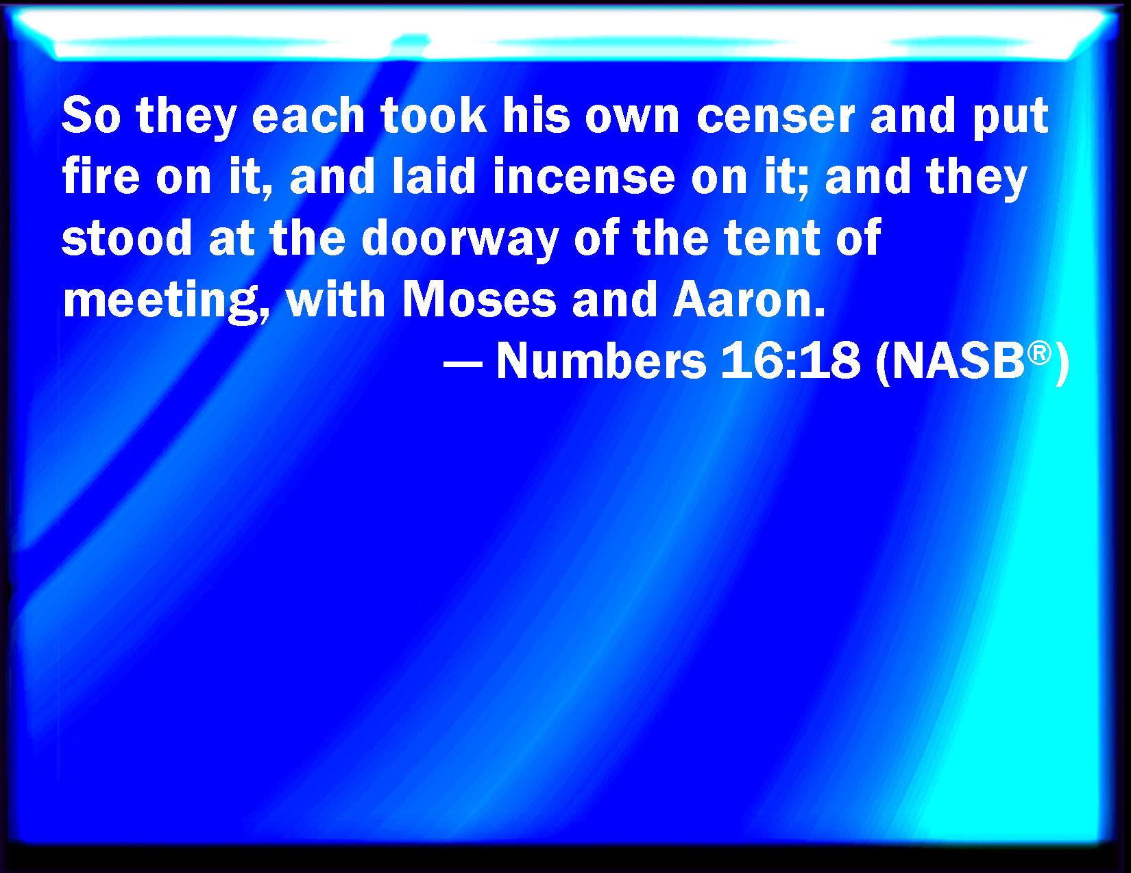 Bible Verse Slide Numbers 16:18 And they took every man his censer, and put fire in them, and laid incense thereon, and stood in the door of the tabernacle of the congregation with Moses and Aaron. KJV: And they took every man his censer, and put fire in them, and laid incense thereon, and stood in the door of the tabernacle of the congregation with Moses and Aaron. DRB: When they had done this, Moses and Aaron standing, DBT: And they took each his censer, and put fire on them, and laid incense thereon, and stood before the entrance to the tent of meeting, as well as Moses and Aaron. ERV: And they took every man his censer, and put fire in them, and laid incense thereon, and stood at the door of the tent of meeting with Moses and Aaron. WBT: And they took every man his censer, and put fire in them, and laid incense on them, and stood in the door of the tabernacle of the congregation with Moses and Aaron. WEB: They each took his censer, and put fire in them, and laid incense thereon, and stood at the door of the Tent of Meeting with Moses and Aaron. YLT: And they take each his censer, and put on them fire, and lay on them perfume, and they stand at the opening of the tent of meeting, with Moses and Aaron.Links Numbers 16:18 NIV • Numbers 16:18 NLT • Numbers 16:18 ESV • Numbers 16:18 NASB • Numbers 16:18 KJV • Numbers 16:18 Interlinear • Numbers 16:18 Commentaries • Numbers 16:18 Parallel Texts • Numbers 16:18 Bible Apps • Numbers 16:18 Parallel • Bible Hub |