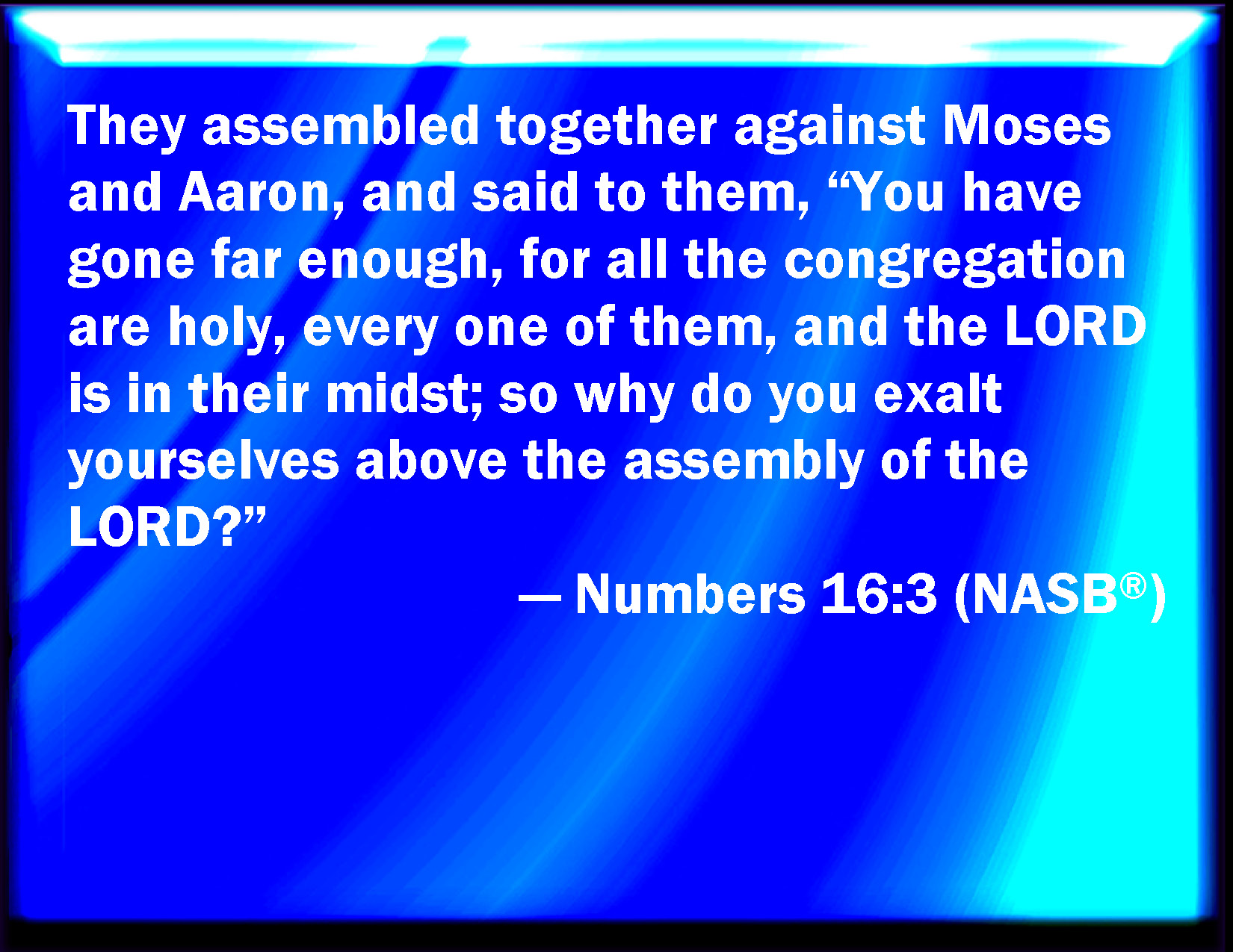 Bible Verse Slide Numbers 16:3 And they gathered themselves together against Moses and against Aaron, and said to them, You take too much on you, seeing all the congregation are holy, every one of them, and the LORD is among them: why then lift you up yourselves above the congregation of the LORD? KJV: And they gathered themselves together against Moses and against Aaron, and said unto them, Ye take too much upon you, seeing all the congregation are holy, every one of them, and the LORD is among them: wherefore then lift ye up yourselves above the congregation of the LORD? DRB: And when they had stood up against Moses and Aaron, they said: Let it be enough for you, that all the multitude consisteth of holy ones, and the Lord is among them: Why lift you up yourselves above the people of the Lord? DBT: and they gathered themselves together against Moses and against Aaron, and said to them, It is enough; for all the assembly, all of them are holy, and Jehovah is among them; and why do ye lift up yourselves above the congregation of Jehovah? ERV: and they assembled themselves together against Moses and against Aaron, and said unto them, Ye take too much upon you, seeing all the congregation are holy, every one of them, and the LORD is among them: wherefore then lift ye up yourselves above the assembly of the LORD? WBT: And they assembled themselves against Moses and against Aaron, and said to them, Ye take too much upon you, seeing all the congregation are holy, every one of them, and the LORD is among them: why then do ye raise yourselves above the congregation of the LORD? WEB: and they assembled themselves together against Moses and against Aaron, and said to them, "You take too much on yourself, since all the congregation are holy, everyone of them, and Yahweh is among them: why then lift yourselves up above the assembly of Yahweh?" YLT: and they are assembled against Moses and against Aaron, and say unto them, 'Enough of you! for all the company — all of them are holy, and in their midst is Jehovah; and wherefore do ye lift yourselves up above the assembly of Jehovah?'Links Numbers 16:3 NIV • Numbers 16:3 NLT • Numbers 16:3 ESV • Numbers 16:3 NASB • Numbers 16:3 KJV • Numbers 16:3 Interlinear • Numbers 16:3 Commentaries • Numbers 16:3 Parallel Texts • Numbers 16:3 Bible Apps • Numbers 16:3 Parallel • Bible Hub |