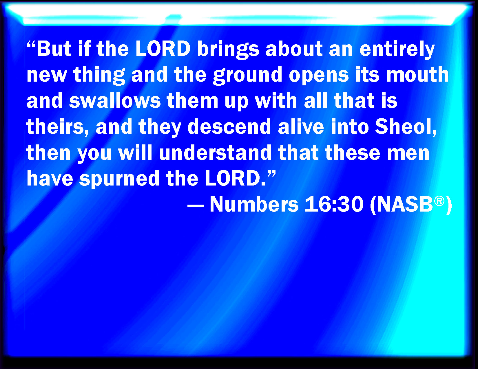 Bible Verse Slide Numbers 16:30 But if the LORD make a new thing, and the earth open her mouth, and swallow them up, with all that appertain to them, and they go down quick into the pit; then you shall understand that these men have provoked the LORD. KJV: But if the LORD make a new thing, and the earth open her mouth, and swallow them up, with all that appertain unto them, and they go down quick into the pit; then ye shall understand that these men have provoked the LORD. DRB: But if the Lord do a new thing, and the earth opening her mouth swallow them down, and all things that belong to them, and they go down alive into hell, you shall know that they have blasphemed the Lord. DBT: but if Jehovah make a new thing, and the ground open its mouth, and swallow them up, and all that they have, and they go down alive into Sheol, then ye shall know that these men have despised Jehovah. ERV: But if the LORD make a new thing, and the ground open her mouth, and swallow them up, with all that appertain unto them, and they go down alive into the pit; then ye shall understand that these men have despised the LORD. WBT: But if the LORD shall make a new thing, and the earth shall open her mouth, and swallow them up, with all that appertain to them, and they go down quick into the pit; then ye shall understand that these men have provoked the LORD. WEB: But if Yahweh make a new thing, and the ground open its mouth, and swallow them up, with all that appertain to them, and they go down alive into Sheol; then you shall understand that these men have despised Yahweh." YLT: and if a strange thing Jehovah do, and the ground hath opened her mouth and swallowed them, and all that they have, and they have gone down alive to Sheol — then ye have known that these men have despised Jehovah.'Links Numbers 16:30 NIV • Numbers 16:30 NLT • Numbers 16:30 ESV • Numbers 16:30 NASB • Numbers 16:30 KJV • Numbers 16:30 Interlinear • Numbers 16:30 Commentaries • Numbers 16:30 Parallel Texts • Numbers 16:30 Bible Apps • Numbers 16:30 Parallel • Bible Hub |