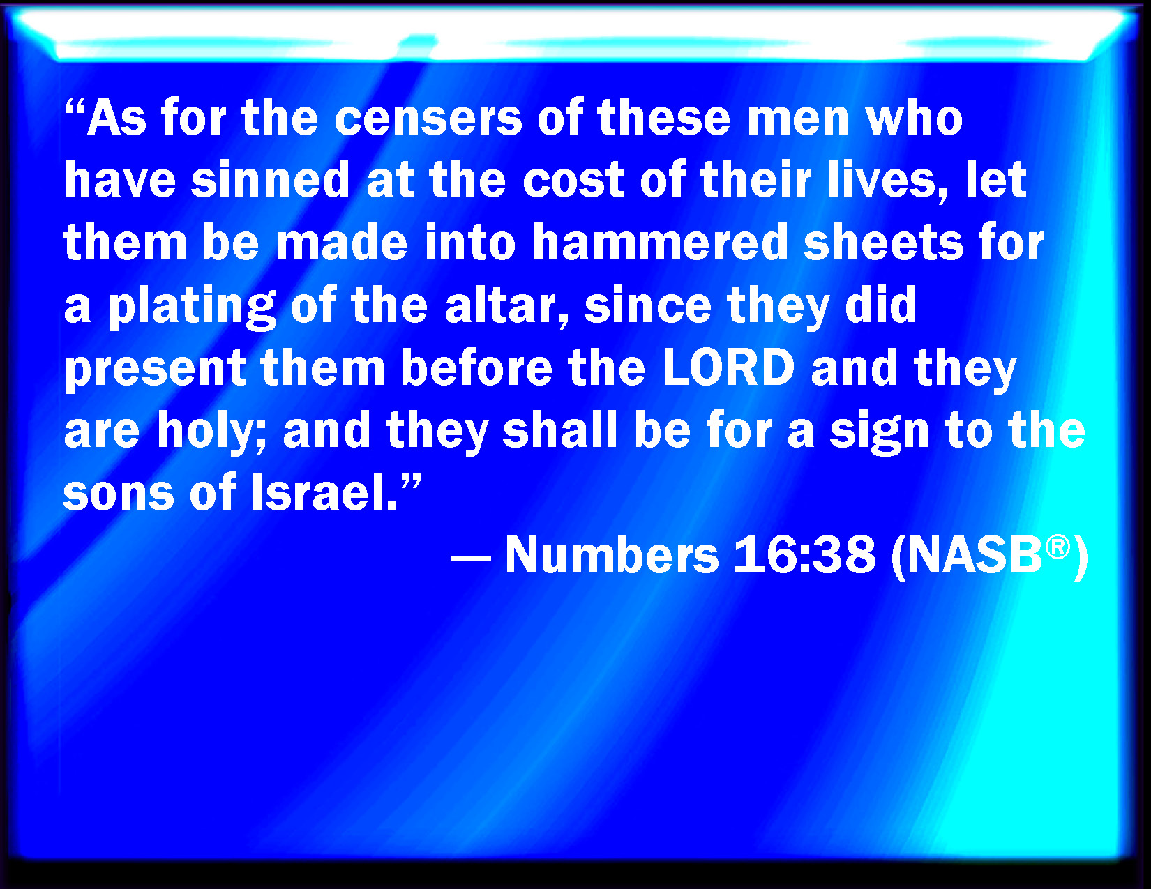 Numbers 16:38 The censers of these sinners against their own souls, let them make them broad plates for a covering of the altar: for they offered them before the LORD, therefore they are hallowed: and they shall be a sign to the children of Israel.