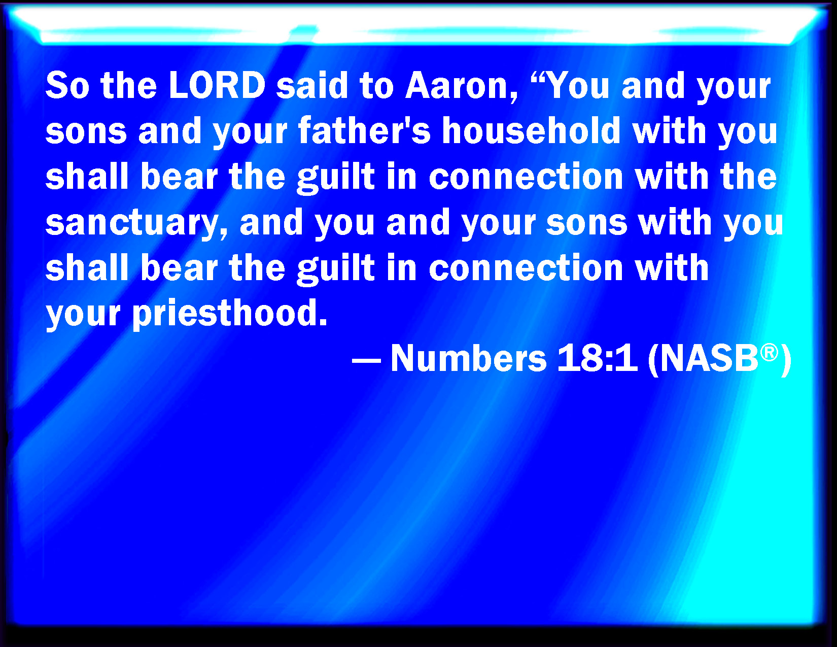 Bible Verse Slide Numbers 18:1 And the LORD said to Aaron, You and your sons and your father's house with you shall bear the iniquity of the sanctuary: and you and your sons with you shall bear the iniquity of your priesthood. KJV: And the LORD said unto Aaron, Thou and thy sons and thy father's house with thee shall bear the iniquity of the sanctuary: and thou and thy sons with thee shall bear the iniquity of your priesthood. DRB: And the Lord said to Aaron: Thou, and thy sons, and thy father's house with thee shall bear the iniquity of the sanctuary: and thou and thy sons with thee shall bear the sins of your priesthood. DBT: And Jehovah said to Aaron, Thou and thy sons and thy father's house with thee shall bear the iniquity of the sanctuary; and thou and thy sons with thee shall bear the iniquity of your priesthood. ERV: And the LORD said unto Aaron, Thou and thy sons and thy fathers' house with thee shall bear the iniquity of the sanctuary: and thou and thy sons with thee shall bear the iniquity of your priesthood. WBT: And the LORD said to Aaron, Thou and thy sons and thy father's house with thee shall bear the iniquity of the sanctuary: and thou and thy sons with thee shall bear the iniquity of your priesthood. WEB: Yahweh said to Aaron, "You and your sons and your fathers' house with you shall bear the iniquity of the sanctuary; and you and your sons with you shall bear the iniquity of your priesthood. YLT: And Jehovah saith unto Aaron, 'Thou, and thy sons, and the house of thy father with thee, do bear the iniquity of the sanctuary; and thou, and thy sons with thee, do bear the iniquity of your priesthood;Links Numbers 18:1 NIV • Numbers 18:1 NLT • Numbers 18:1 ESV • Numbers 18:1 NASB • Numbers 18:1 KJV • Numbers 18:1 Interlinear • Numbers 18:1 Commentaries • Numbers 18:1 Parallel Texts • Numbers 18:1 Bible Apps • Numbers 18:1 Parallel • Bible Hub |