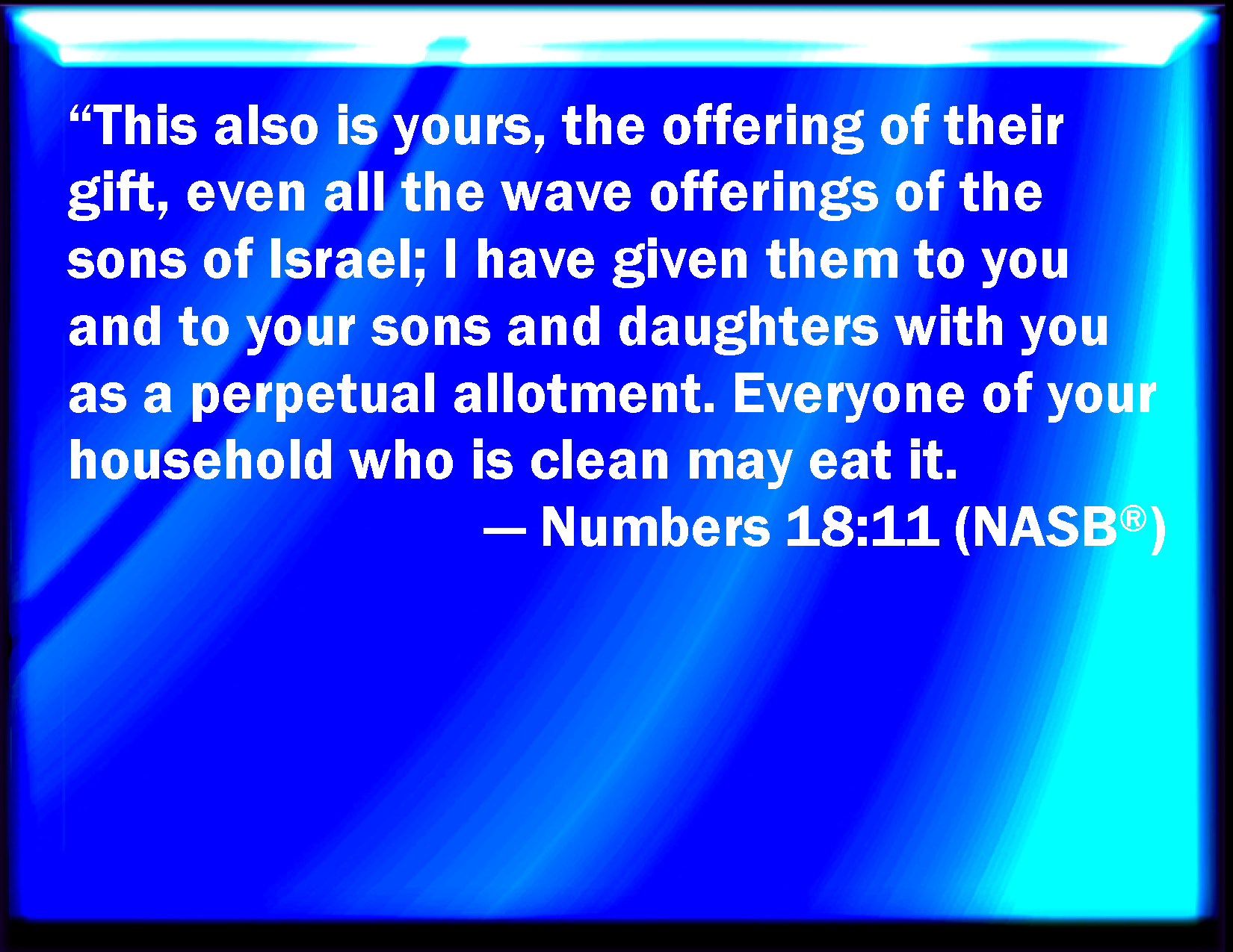 Bible Verse Slide Numbers 18:11 And this is yours; the heave offering of their gift, with all the wave offerings of the children of Israel: I have given them to you, and to your sons and to your daughters with you, by a statute for ever: every one that is clean in your house shall eat of it. KJV: And this is thine; the heave offering of their gift, with all the wave offerings of the children of Israel: I have given them unto thee, and to thy sons and to thy daughters with thee, by a statute for ever: every one that is clean in thy house shall eat of it. DRB: But the firstfruits, which the children of Israel shall vow and offer, I have given to thee, and to thy sons, and to thy daughters, by a perpetual law. He that is clean in thy house, shall eat them. DBT: And this shall be thine: the heave-offering of their gift, with all the wave-offerings of the children of Israel; I have given them unto thee, and to thy sons and to thy daughters with thee, by an everlasting statute; every one that is clean in thy house shall eat of it. ERV: And this is thine; the heave offering of their gift, even all the wave offerings of the children of Israel: I have given them unto thee, and to thy sons and to thy daughters with thee, as a due for ever: every one that is clean in thy house shall eat thereof. WBT: And this is thine; the heave-offering of their gift, with all the wave-offerings of the children of Israel: I have given them to thee, and to thy sons, and to thy daughters with thee, by a statute for ever: every one that is clean in thy house shall eat of it. WEB: "This is yours, too: the wave offering of their gift, even all the wave offerings of the children of Israel. I have given them to you, and to your sons and to your daughters with you, as a portion forever. Everyone who is clean in your house shall eat of it. YLT: And this is thine: the heave-offering of their gift, to all the wave-offerings of the sons of Israel, to thee I have given them, and to thy sons, and to thy daughters with thee, by a statute age-during; every clean one in thy house doth eat it;Links Numbers 18:11 NIV • Numbers 18:11 NLT • Numbers 18:11 ESV • Numbers 18:11 NASB • Numbers 18:11 KJV • Numbers 18:11 Interlinear • Numbers 18:11 Commentaries • Numbers 18:11 Parallel Texts • Numbers 18:11 Bible Apps • Numbers 18:11 Parallel • Bible Hub |