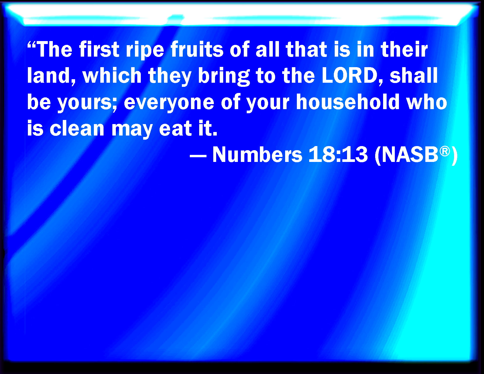 Bible Verse Slide Numbers 18:13 And whatever is first ripe in the land, which they shall bring to the LORD, shall be yours; every one that is clean in your house shall eat of it. KJV: And whatsoever is first ripe in the land, which they shall bring unto the LORD, shall be thine; every one that is clean in thine house shall eat of it. DRB: All the firstripe of the fruits, that the ground bringeth forth, and which are brought to the Lord, shall be for thy use: he that is clean in thy house, shall eat them. DBT: The first ripe of everything that is in their land, which they shall bring to Jehovah, shall be thine; every one that is clean in thy house shall eat of it. ERV: The firstripe fruits of all that is in their land, which they bring unto the LORD, shall be thine; every one that is clean in thy house shall eat thereof. WBT: And whatever is first ripe in the land, which they shall bring to the LORD, shall be thine; every one that is clean in thy house shall eat of it. WEB: The first-ripe fruits of all that is in their land, which they bring to Yahweh, shall be yours; everyone who is clean in your house shall eat of it. YLT: The first-fruits of all that is in their land, which they bring in to Jehovah, are thine; every clean one in thy house doth eat it;Links Numbers 18:13 NIV • Numbers 18:13 NLT • Numbers 18:13 ESV • Numbers 18:13 NASB • Numbers 18:13 KJV • Numbers 18:13 Interlinear • Numbers 18:13 Commentaries • Numbers 18:13 Parallel Texts • Numbers 18:13 Bible Apps • Numbers 18:13 Parallel • Bible Hub |