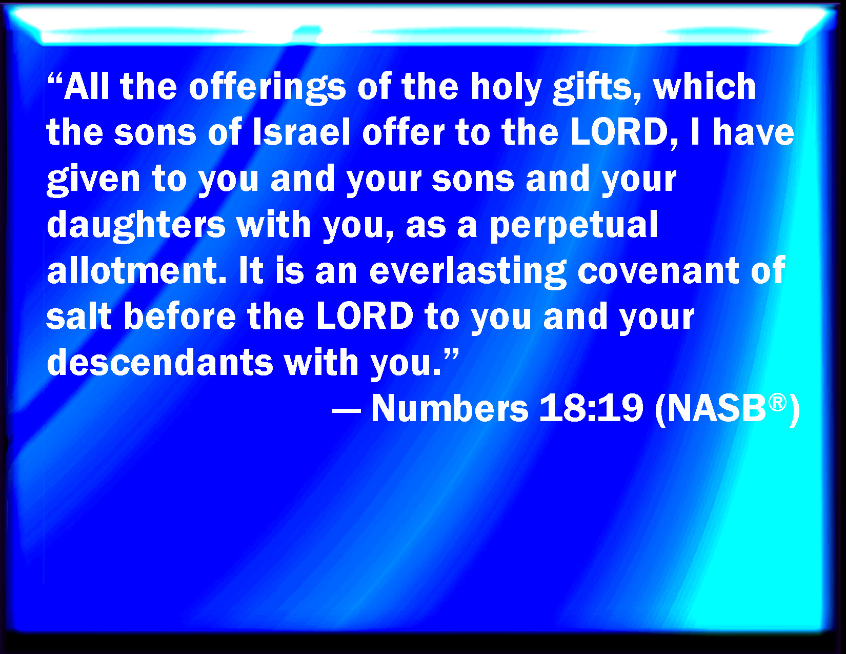 Bible Verse Slide Numbers 18:19 All the heave offerings of the holy things, which the children of Israel offer to the LORD, have I given you, and your sons and your daughters with you, by a statute for ever: it is a covenant of salt for ever before the LORD to you and to your seed with you. KJV: All the heave offerings of the holy things, which the children of Israel offer unto the LORD, have I given thee, and thy sons and thy daughters with thee, by a statute for ever: it is a covenant of salt for ever before the LORD unto thee and to thy seed with thee. DRB: All the firstfruits of the sanctuary which the children of Israel offer to the Lord, I have given to thee and to thy sons and daughters, by a perpetual ordinance. It is a covenant of salt for ever before the Lord, to thee and to thy sons. DBT: All the heave-offerings of the holy things, which the children of Israel offer to Jehovah, have I given thee, and to thy sons and to thy daughters with thee, by an everlasting statute: it shall be an everlasting covenant of salt before Jehovah unto thee and thy seed with thee. ERV: All the heave offerings of the holy things, which the children of Israel offer unto the LORD, have I given thee, and thy sons and thy daughters with thee, as a due for ever: it is a covenant of salt for ever before the LORD unto thee and to thy seed with thee. WBT: All the heave-offerings of the holy things, which the children of Israel offer to the LORD, have I given to thee, and to thy sons and thy daughters with thee, by a statute for ever: it is a covenant of salt for ever before the LORD to thee and to thy seed with thee. WEB: All the wave offerings of the holy things, which the children of Israel offer to Yahweh, have I given you, and your sons and your daughters with you, as a portion forever: it is a covenant of salt forever before Yahweh to you and to your seed with you." YLT: all the heave-offerings of the holy things which the sons of Israel lift up to Jehovah I have given to thee and to thy sons, and to thy daughters with thee, by a statute age-during, a covenant of salt, age-during it is before Jehovah, to thee and to thy seed with thee.'Links Numbers 18:19 NIV • Numbers 18:19 NLT • Numbers 18:19 ESV • Numbers 18:19 NASB • Numbers 18:19 KJV • Numbers 18:19 Interlinear • Numbers 18:19 Commentaries • Numbers 18:19 Parallel Texts • Numbers 18:19 Bible Apps • Numbers 18:19 Parallel • Bible Hub |