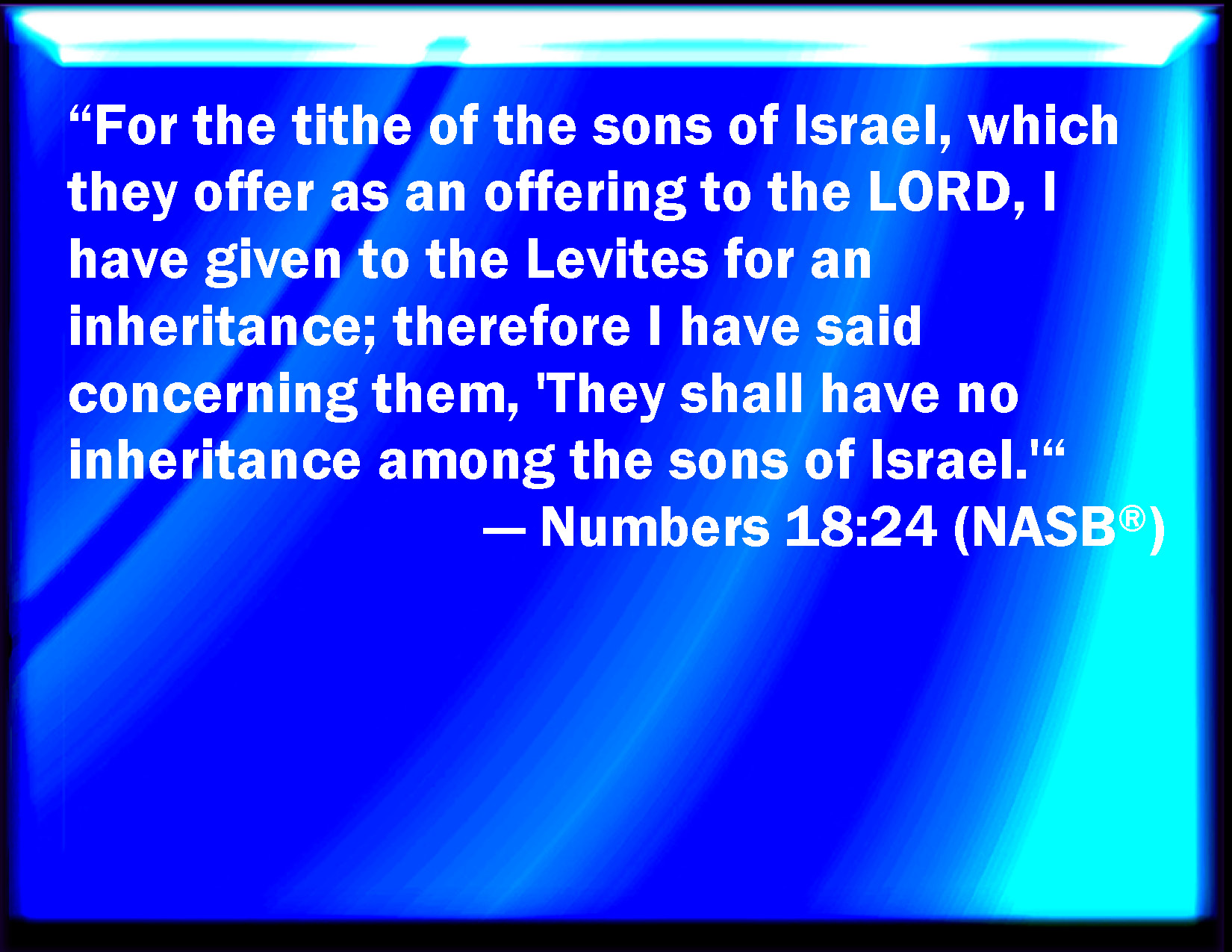 Bible Verse Slide Numbers 18:24 But the tithes of the children of Israel, which they offer as an heave offering to the LORD, I have given to the Levites to inherit: therefore I have said to them, Among the children of Israel they shall have no inheritance. KJV: But the tithes of the children of Israel, which they offer as an heave offering unto the LORD, I have given to the Levites to inherit: therefore I have said unto them, Among the children of Israel they shall have no inheritance. DRB: But be content with the oblation or tithes, which I have separated for their uses and necessities. DBT: for I have given for an inheritance to the Levites the tithes of the children of Israel, which they offer as a heave-offering to Jehovah; therefore I have said of them, They shall possess no inheritance among the children of Israel. ERV: For the tithe of the children of Israel, which they offer as an heave offering unto the LORD, I have given to the Levites for an inheritance: therefore I have said unto them, Among the children of Israel they shall have no inheritance. WBT: But the tithes of the children of Israel, which they offer as a heave-offering to the LORD, I have given to the Levites to inherit: therefore I have said to them, Among the children of Israel they shall have no inheritance. WEB: For the tithe of the children of Israel, which they offer as a wave offering to Yahweh, I have given to the Levites for an inheritance: therefore I have said to them, 'Among the children of Israel they shall have no inheritance.'" YLT: but the tithe of the sons of Israel which they lift up to Jehovah, a heave-offering, I have given to the Levites for inheritance; therefore I have said of them, In the midst of the sons of Israel they have no inheritance.'Links Numbers 18:24 NIV • Numbers 18:24 NLT • Numbers 18:24 ESV • Numbers 18:24 NASB • Numbers 18:24 KJV • Numbers 18:24 Interlinear • Numbers 18:24 Commentaries • Numbers 18:24 Parallel Texts • Numbers 18:24 Bible Apps • Numbers 18:24 Parallel • Bible Hub |