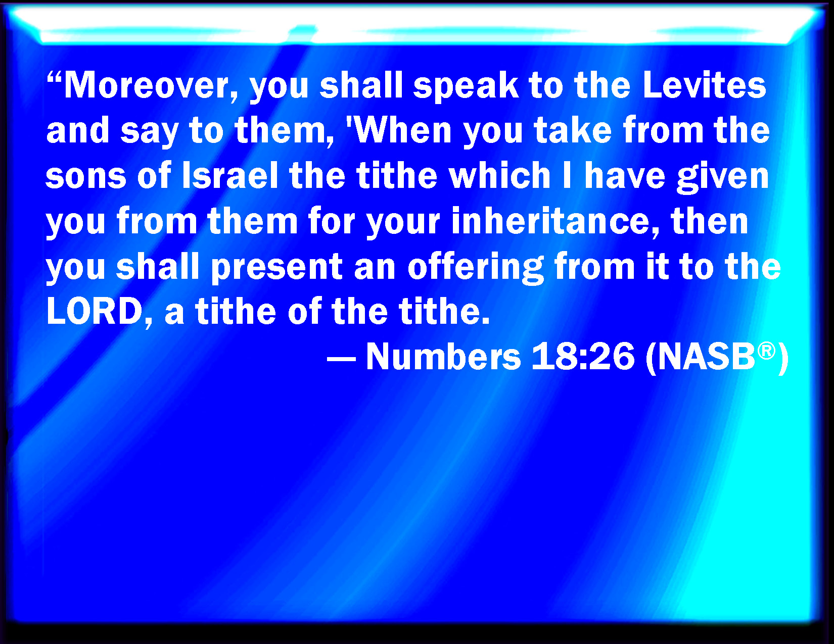 Bible Verse Slide Numbers 18:26 Thus speak to the Levites, and say to them, When you take of the children of Israel the tithes which I have given you from them for your inheritance, then you shall offer up an heave offering of it for the LORD, even a tenth part of the tithe. KJV: Thus speak unto the Levites, and say unto them, When ye take of the children of Israel the tithes which I have given you from them for your inheritance, then ye shall offer up an heave offering of it for the LORD, even a tenth part of the tithe. DRB: Command the Levites, and declare unto them: When you shall receive of the children of Israel the tithes, which I have given you, offer the firstfruits of them to the Lord, that is to say, the tenth part of the tenth: DBT: And to the Levites shalt thou speak, and say unto them, When ye take of the children of Israel the tithes which I have given you from them for your inheritance, then ye shall offer a heave-offering from it for Jehovah, the tenth of the tithe. ERV: Moreover thou shalt speak unto the Levites, and say unto them, When ye take of the children of Israel the tithe which I have given you from them for your inheritance, then ye shall offer up an heave offering of it for the LORD, a tithe of the tithe. WBT: Thus speak to the Levites, and say to them, When ye take of the children of Israel the tithes which I have given you from them for your inheritance, then ye shall offer up a heave-offering of it for the LORD, even a tenth part of the tithe. WEB: "Moreover you shall speak to the Levites, and tell them, 'When you take of the children of Israel the tithe which I have given you from them for your inheritance, then you shall offer up a wave offering of it for Yahweh, a tithe of the tithe. YLT: 'And unto the Levites thou dost speak; and thou hast said unto them, When ye take from the sons of Israel the tithe which I have given to you from them, for your inheritance, then ye have lifted up from it the heave-offering of Jehovah, a tithe of the tithe;Links Numbers 18:26 NIV • Numbers 18:26 NLT • Numbers 18:26 ESV • Numbers 18:26 NASB • Numbers 18:26 KJV • Numbers 18:26 Interlinear • Numbers 18:26 Commentaries • Numbers 18:26 Parallel Texts • Numbers 18:26 Bible Apps • Numbers 18:26 Parallel • Bible Hub |