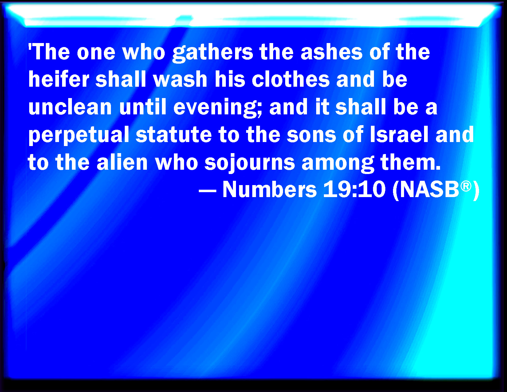 Bible Verse Slide Numbers 19:10 And he that gathers the ashes of the heifer shall wash his clothes, and be unclean until the even: and it shall be to the children of Israel, and to the stranger that sojournes among them, for a statute for ever. KJV: And he that gathereth the ashes of the heifer shall wash his clothes, and be unclean until the even: and it shall be unto the children of Israel, and unto the stranger that sojourneth among them, for a statute for ever. DRB: And when he that carried the ashes of the cow, hath washed his garments, he shall be unclean until the evening. The children of Israel, and the strangers that dwell among them, shall observe this for a holy thing by a perpetual ordinance. DBT: And he that hath gathered the ashes of the heifer shall wash his clothes, and be unclean until the even. And it shall be unto the children of Israel, and unto the stranger that sojourneth among them, an everlasting statute. ERV: And he that gathereth the ashes of the heifer shall wash his clothes, and be unclean until the even: and it shall be unto the children of Israel, and unto the stranger that sojourneth among them, for a statute for ever. WBT: And he that gathereth the ashes of the heifer shall wash his clothes, and be unclean until the evening: and it shall be to the children of Israel, and to the stranger that sojourneth among them, for a statute for ever. WEB: He who gathers the ashes of the heifer shall wash his clothes, and be unclean until the evening: and it shall be to the children of Israel, and to the stranger who lives as a foreigner among them, for a statute forever. YLT: and he who is gathering the ashes of the heifer hath washed his garments, and is unclean till the evening; and it hath been to the sons of Israel, and to the sojourner who is sojourning in their midst, for a statute age-during.Links Numbers 19:10 NIV • Numbers 19:10 NLT • Numbers 19:10 ESV • Numbers 19:10 NASB • Numbers 19:10 KJV • Numbers 19:10 Interlinear • Numbers 19:10 Commentaries • Numbers 19:10 Parallel Texts • Numbers 19:10 Bible Apps • Numbers 19:10 Parallel • Bible Hub |