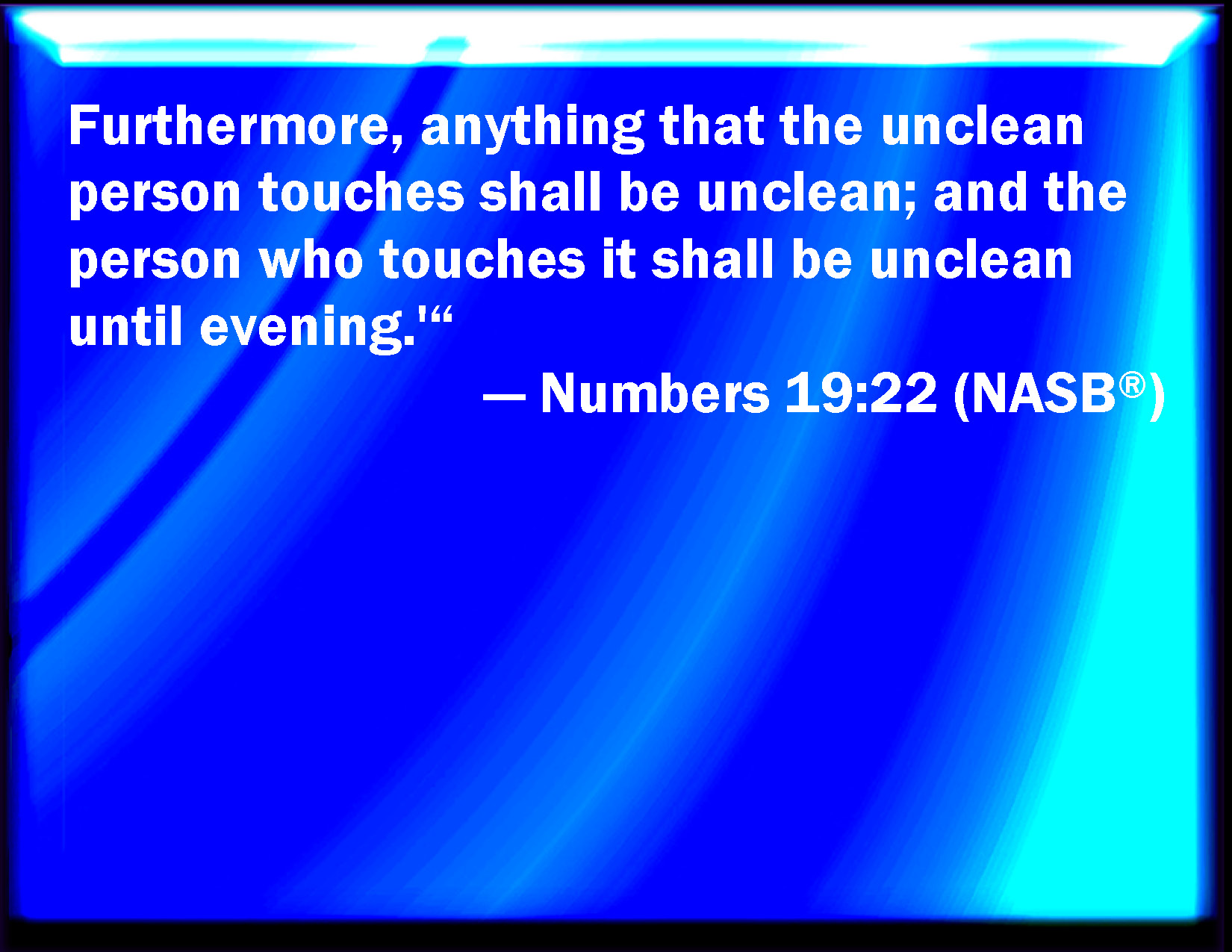 Numbers 19:22 And whatever the unclean person touches shall be unclean; and the soul that touches it shall be unclean until even.