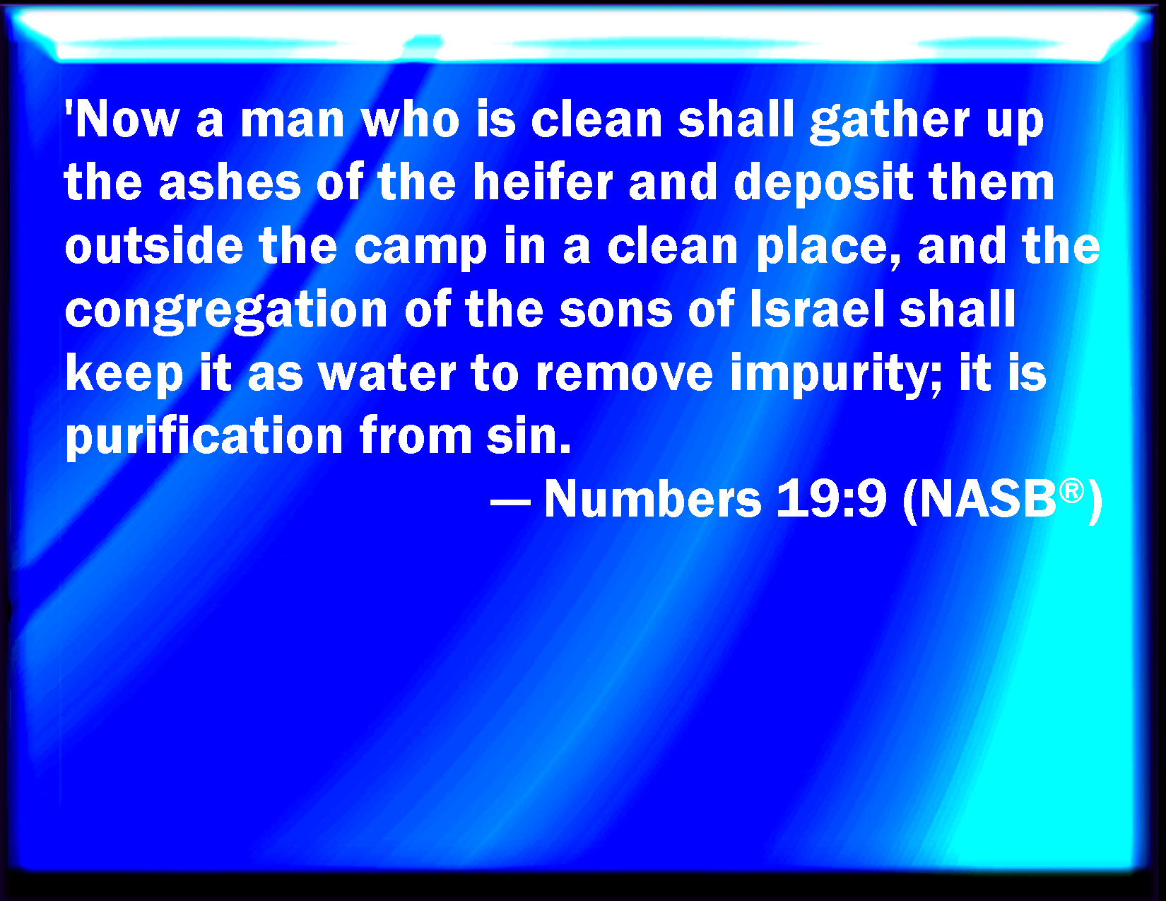Bible Verse Slide Numbers 19:9 And a man that is clean shall gather up the ashes of the heifer, and lay them up without the camp in a clean place, and it shall be kept for the congregation of the children of Israel for a water of separation: it is a purification for sin. KJV: And a man that is clean shall gather up the ashes of the heifer, and lay them up without the camp in a clean place, and it shall be kept for the congregation of the children of Israel for a water of separation: it is a purification for sin. DRB: And a man that is clean shall gather up the ashes of the cow, and shall pour them forth without the camp in a most clean place, that they may be reserved for the multitude of the children of Israel, and for a water of aspersion: because the cow was burnt for sin. DBT: And a clean man shall gather the ashes of the heifer, and deposit them outside the camp in a clean place, and it shall be kept for the assembly of the children of Israel for a water of separation: it is a purification for sin. ERV: And a man that is clean shall gather up the ashes of the heifer, and lay them up without the camp in a clean place, and it shall be kept for the congregation of the children of Israel for a water of separation: it is a sin offering. WBT: And a man that is clean shall gather the ashes of the heifer, and lay them without the camp in a clean place, and it shall be kept for the congregation of the children of Israel, for a water of separation: it is a purification for sin. WEB: "A man who is clean shall gather up the ashes of the heifer, and lay them up outside of the camp in a clean place; and it shall be kept for the congregation of the children of Israel for a water for impurity: it is a sin offering. YLT: And a clean man hath gathered the ashes of the cow, and hath placed at the outside of the camp, in a clean place, and it hath become to the company of the sons of Israel a charge for waters of separation — it is a cleansing;Links Numbers 19:9 NIV • Numbers 19:9 NLT • Numbers 19:9 ESV • Numbers 19:9 NASB • Numbers 19:9 KJV • Numbers 19:9 Interlinear • Numbers 19:9 Commentaries • Numbers 19:9 Parallel Texts • Numbers 19:9 Bible Apps • Numbers 19:9 Parallel • Bible Hub |