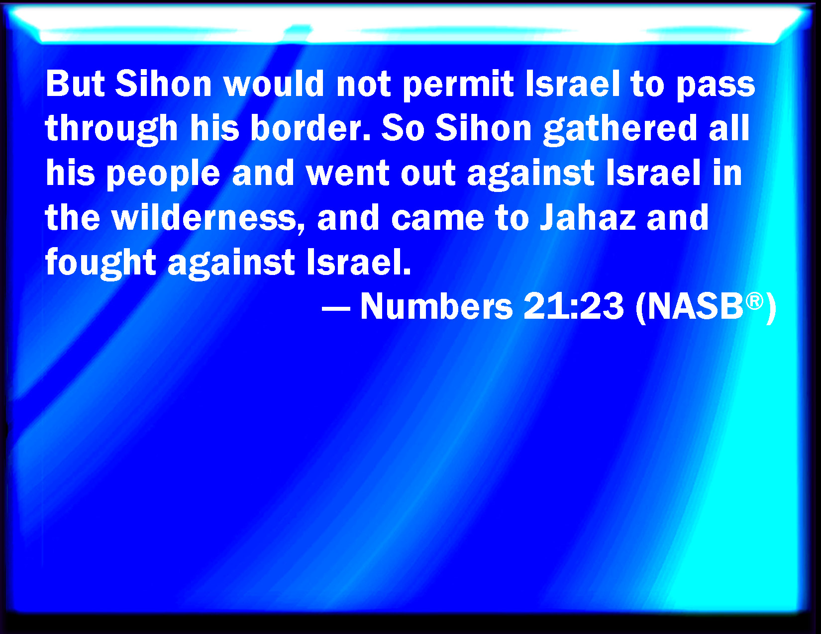 Bible Verse Slide Numbers 21:23 And Sihon would not suffer Israel to pass through his border: but Sihon gathered all his people together, and went out against Israel into the wilderness: and he came to Jahaz, and fought against Israel. KJV: And Sihon would not suffer Israel to pass through his border: but Sihon gathered all his people together, and went out against Israel into the wilderness: and he came to Jahaz, and fought against Israel. DRB: And he would not grant that Israel should pass by his borders: but rather gathering an army, went forth to meet them in the desert, and came to Jasa, and fought against them. DBT: But Sihon would not suffer Israel to go through his border; and Sihon gathered all his people, and went out against Israel into the wilderness, and came to Jahaz, and fought against Israel. ERV: And Sihon would not suffer Israel to pass through his border: but Sihon gathered all his people together, and went out against Israel into the wilderness, and came to Jahaz: and he fought against Israel. WBT: And Sihon would not suffer Israel to pass through his border: but Sihon collected all his people, and went out against Israel into the wilderness: and he came to Jahaz, and fought against Israel: WEB: Sihon would not allow Israel to pass through his border: but Sihon gathered all his people together, and went out against Israel into the wilderness, and came to Jahaz; and he fought against Israel. YLT: And Sihon hath not suffered Israel to pass through his border, and Sihon gathereth all his people, and cometh out to meet Israel into the wilderness, and cometh in to Jahaz, and fighteth against Israel.Links Numbers 21:23 NIV • Numbers 21:23 NLT • Numbers 21:23 ESV • Numbers 21:23 NASB • Numbers 21:23 KJV • Numbers 21:23 Interlinear • Numbers 21:23 Commentaries • Numbers 21:23 Parallel Texts • Numbers 21:23 Bible Apps • Numbers 21:23 Parallel • Bible Hub |