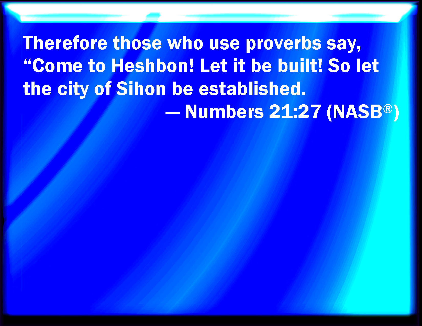 Bible Verse Slide Numbers 21:27 Why they that speak in proverbs say, Come into Heshbon, let the city of Sihon be built and prepared: KJV: Wherefore they that speak in proverbs say, Come into Heshbon, let the city of Sihon be built and prepared: DRB: Therefore it is said in the proverb: Come into Hesebon, let the city of Sehon be built and set up: DBT: Therefore the poets say, Come to Heshbon; let the city of Sihon be built and established. ERV: Wherefore they that speak in proverbs say, Come ye to Heshbon, Let the city of Sihon be built and established: WBT: Wherefore they that speak in proverbs say, Come into Heshbon, let the city of Sihon be built and prepared. WEB: Therefore those who speak in proverbs say, "Come to Heshbon. Let the city of Sihon be built and established; YLT: therefore those using similes say — 'Enter ye Heshbon, Let the city of Sihon be built and ready,Links Numbers 21:27 NIV • Numbers 21:27 NLT • Numbers 21:27 ESV • Numbers 21:27 NASB • Numbers 21:27 KJV • Numbers 21:27 Interlinear • Numbers 21:27 Commentaries • Numbers 21:27 Parallel Texts • Numbers 21:27 Bible Apps • Numbers 21:27 Parallel • Bible Hub |
