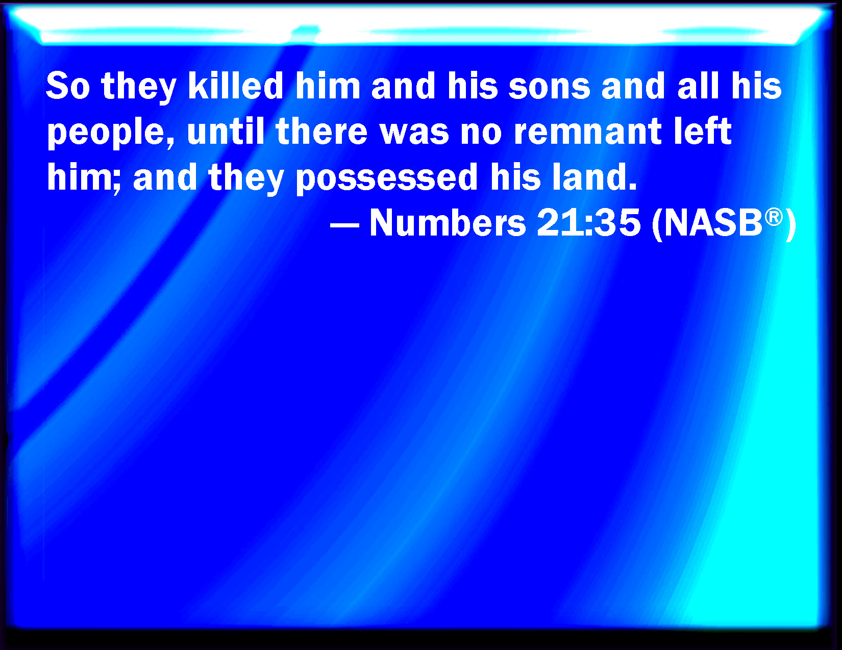 Bible Verse Slide Numbers 21:35 So they smote him, and his sons, and all his people, until there was none left him alive: and they possessed his land. KJV: So they smote him, and his sons, and all his people, until there was none left him alive: and they possessed his land. DRB: So they slew him also with his sons, and all his people, not letting any one escape, and they possessed his land. DBT: And they smote him, and his sons, and all his people, so that they left him none remaining, and took possession of his land. ERV: So they smote him, and his sons, and all his people, until there was none left him remaining: and they possessed his land. WBT: So they smote him, and his sons, and all his people, until there was none left to him alive: and they possessed his land. WEB: So they struck him, and his sons and all his people, until there was none left him remaining: and they possessed his land. YLT: And they smite him, and his sons, and all his people, until he hath not left to him a remnant, and they possess his land.Links Numbers 21:35 NIV • Numbers 21:35 NLT • Numbers 21:35 ESV • Numbers 21:35 NASB • Numbers 21:35 KJV • Numbers 21:35 Interlinear • Numbers 21:35 Commentaries • Numbers 21:35 Parallel Texts • Numbers 21:35 Bible Apps • Numbers 21:35 Parallel • Bible Hub |