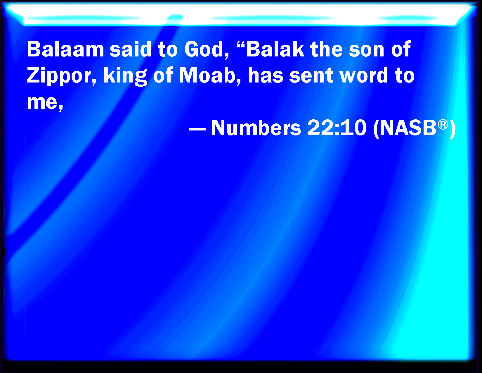 Bible Verse Slide Numbers 22:10 And Balaam said to God, Balak the son of Zippor, king of Moab, has sent to me, saying, KJV: And Balaam said unto God, Balak the son of Zippor, king of Moab, hath sent unto me, saying, DRB: He answered: Balac the son of Sephor king of the Moabites hath sent to me, DBT: And Balaam said to God, Balak the son of Zippor, king of Moab, hath sent unto me, ERV: And Balaam said unto God, Balak the son of Zippor, king of Moab, hath sent unto me, saying, WBT: And Balaam said to God, Balak the son of Zippor, king of Moab, hath sent to me, saying, WEB: Balaam said to God, "Balak the son of Zippor, king of Moab, has sent to me, [saying], YLT: And Balaam saith unto God, 'Balak, son of Zippor, king of Moab, hath sent unto me:Links Numbers 22:10 NIV • Numbers 22:10 NLT • Numbers 22:10 ESV • Numbers 22:10 NASB • Numbers 22:10 KJV • Numbers 22:10 Interlinear • Numbers 22:10 Commentaries • Numbers 22:10 Parallel Texts • Numbers 22:10 Bible Apps • Numbers 22:10 Parallel • Bible Hub |