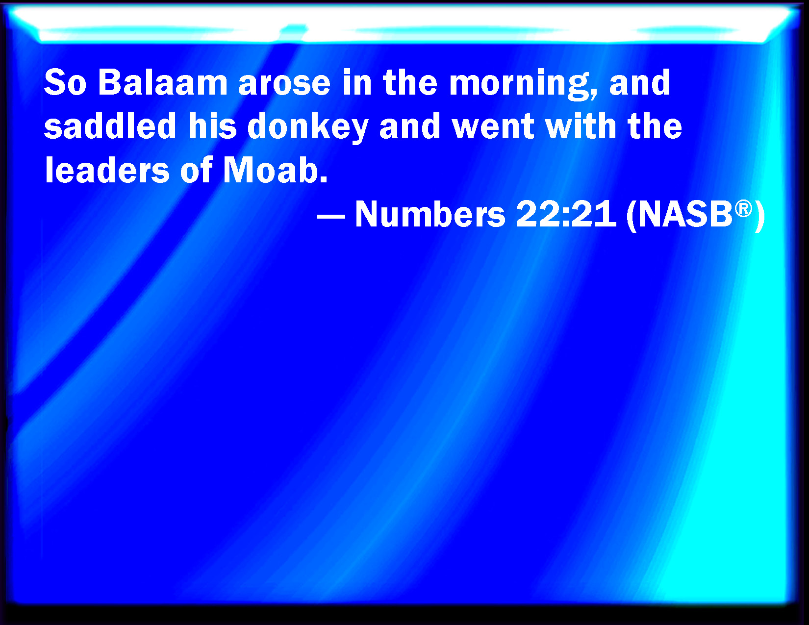 Bible Verse Slide Numbers 22:21 And Balaam rose up in the morning, and saddled his ass, and went with the princes of Moab. KJV: And Balaam rose up in the morning, and saddled his ass, and went with the princes of Moab. DRB: Balaam arose in the morning, and saddling his ass went with them. DBT: And Balaam rose up in the morning, and saddled his ass, and went with the princes of Moab. ERV: And Balaam rose up in the morning, and saddled his ass, and went with the princes of Moab. WBT: And Balaam rose in the morning, and saddled his ass, and went with the princes of Moab. WEB: Balaam rose up in the morning, and saddled his donkey, and went with the princes of Moab. YLT: And Balaam riseth in the morning, and saddleth his ass, and goeth with the princes of Moab,Links Numbers 22:21 NIV • Numbers 22:21 NLT • Numbers 22:21 ESV • Numbers 22:21 NASB • Numbers 22:21 KJV • Numbers 22:21 Interlinear • Numbers 22:21 Commentaries • Numbers 22:21 Parallel Texts • Numbers 22:21 Bible Apps • Numbers 22:21 Parallel • Bible Hub |