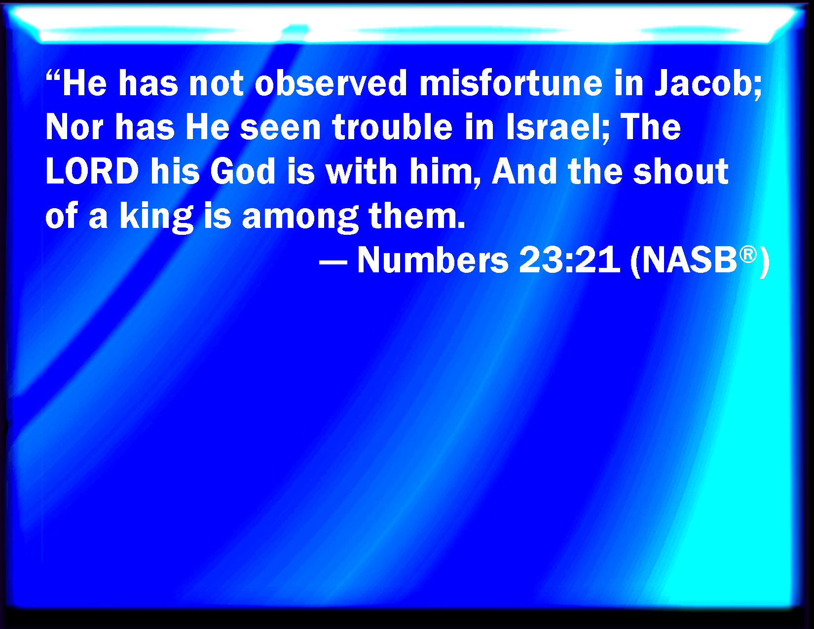 Bible Verse Slide Numbers 23:21 He has not beheld iniquity in Jacob, neither has he seen perverseness in Israel: the LORD his God is with him, and the shout of a king is among them. KJV: He hath not beheld iniquity in Jacob, neither hath he seen perverseness in Israel: the LORD his God is with him, and the shout of a king is among them. DRB: There is no idol in Jacob, neither is there an image god to be seen in Israel. The Lord his God is with him, and the sound of the victory of the king in him. DBT: He hath not beheld iniquity in Jacob, neither hath he seen wrong in Israel; Jehovah his God is with him, and the shout of a king is in his midst. ERV: He hath not beheld iniquity in Jacob, Neither hath he seen perverseness in Israel: The LORD his God is with him, And the shout of a king is among them. WBT: He hath not beheld iniquity in Jacob, neither hath he seen perverseness in Israel; the LORD his God is with him, and the shout of a king is among them. WEB: He has not seen iniquity in Jacob. Neither has he seen perverseness in Israel. Yahweh his God is with him. The shout of a king is among them. YLT: He hath not beheld iniquity in Jacob, Nor hath He seen perverseness in Israel; Jehovah his God is with him, And a shout of a king is in him.Links Numbers 23:21 NIV • Numbers 23:21 NLT • Numbers 23:21 ESV • Numbers 23:21 NASB • Numbers 23:21 KJV • Numbers 23:21 Interlinear • Numbers 23:21 Commentaries • Numbers 23:21 Parallel Texts • Numbers 23:21 Bible Apps • Numbers 23:21 Parallel • Bible Hub |