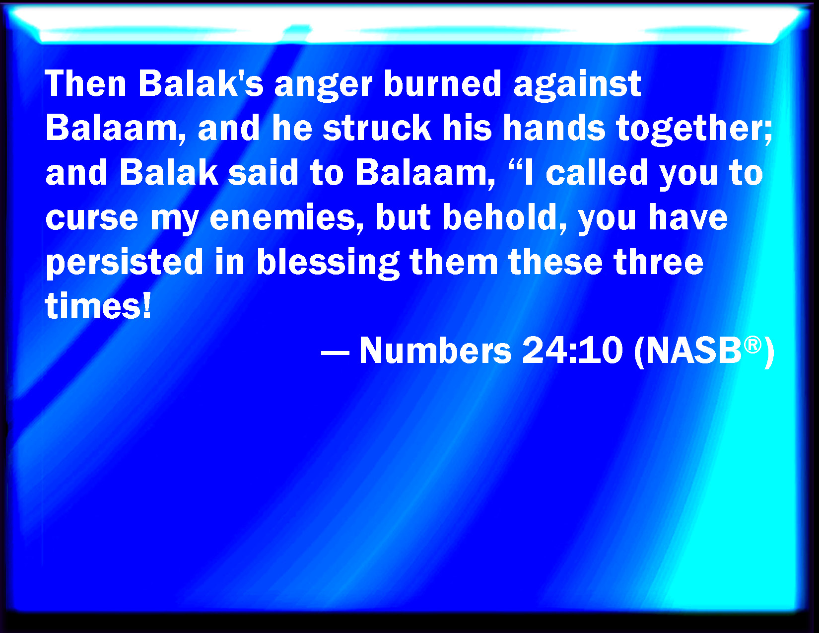 Bible Verse Slide Numbers 24:10 And Balak's anger was kindled against Balaam, and he smote his hands together: and Balak said to Balaam, I called you to curse my enemies, and, behold, you have altogether blessed them these three times. KJV: And Balak's anger was kindled against Balaam, and he smote his hands together: and Balak said unto Balaam, I called thee to curse mine enemies, and, behold, thou hast altogether blessed them these three times. DRB: And Balac being angry against Balaam, clapped his hands together and said: I called thee to curse my enemies, and thou on the contrary hast blessed them three times. DBT: Then Balak's anger was kindled against Balaam, and he smote his hands together; and Balak said to Balaam, I called thee to curse mine enemies, and behold, thou hast altogether blessed them these three times! ERV: And Balak's anger was kindled against Balaam, and he smote his hands together: and Balak said unto Balaam, I called thee to curse mine enemies, and, behold, thou hast altogether blessed them these three times. WBT: And Balak's anger was kindled against Balaam, and he smote his hands together: and Balak said to Balaam, I called thee to curse my enemies, and behold, thou hast altogether blessed them these three times. WEB: Balak's anger was kindled against Balaam, and he struck his hands together; and Balak said to Balaam, "I called you to curse my enemies, and, behold, you have altogether blessed them these three times. YLT: And the anger of Balak burneth against Balaam, and he striketh his hands; and Balak saith unto Balaam, 'To pierce mine enemies I called thee, and lo, thou hast certainly blessed — these three times;Links Numbers 24:10 NIV • Numbers 24:10 NLT • Numbers 24:10 ESV • Numbers 24:10 NASB • Numbers 24:10 KJV • Numbers 24:10 Interlinear • Numbers 24:10 Commentaries • Numbers 24:10 Parallel Texts • Numbers 24:10 Bible Apps • Numbers 24:10 Parallel • Bible Hub |