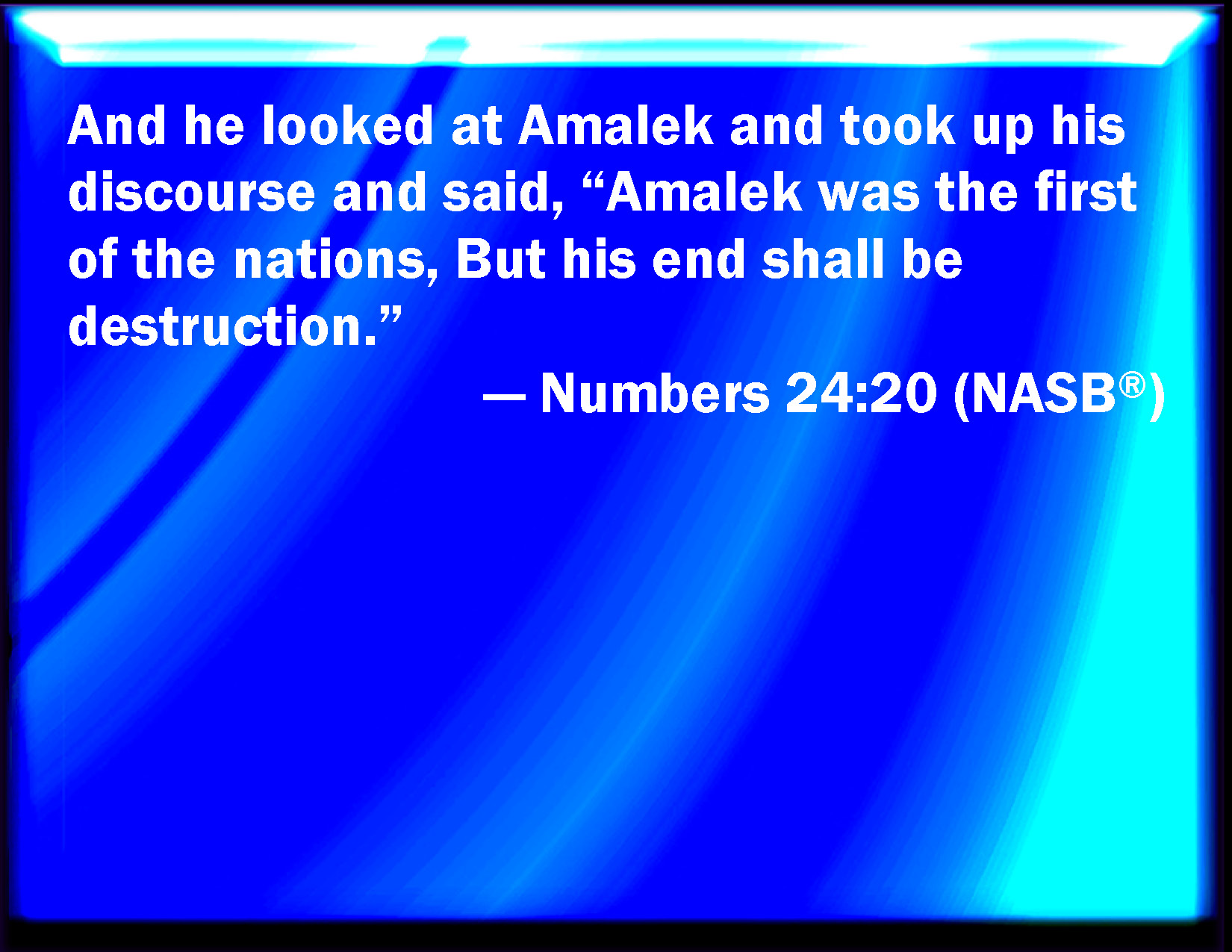 Bible Verse Slide Numbers 24:20 And when he looked on Amalek, he took up his parable, and said, Amalek was the first of the nations; but his latter end shall be that he perish for ever. KJV: And when he looked on Amalek, he took up his parable, and said, Amalek was the first of the nations; but his latter end shall be that he perish for ever. DRB: And when he saw Amalec, he took up his parable, and said: Amalec the beginning of nations, whose latter ends shall be destroyed. DBT: And he saw Amalek, and took up his parable, and said, Amalek is the first of the nations, but his latter end shall be for destruction. ERV: And he looked on Amalek, and took up his parable, and said, Amalek was the first of the nations; But his latter end shall come to destruction. WBT: And when he looked on Amalek, he took up his parable, and said, Amalek was the first of the nations, but his latter end shall be that he shall perish for ever. WEB: He looked at Amalek, and took up his parable, and said, "Amalek was the first of the nations, But his latter end shall come to destruction." YLT: And he seeth Amalek, and taketh up his simile, and saith: 'A beginning of the Goyim is Amalek; And his latter end — for ever he perisheth.'Links Numbers 24:20 NIV • Numbers 24:20 NLT • Numbers 24:20 ESV • Numbers 24:20 NASB • Numbers 24:20 KJV • Numbers 24:20 Interlinear • Numbers 24:20 Commentaries • Numbers 24:20 Parallel Texts • Numbers 24:20 Bible Apps • Numbers 24:20 Parallel • Bible Hub |