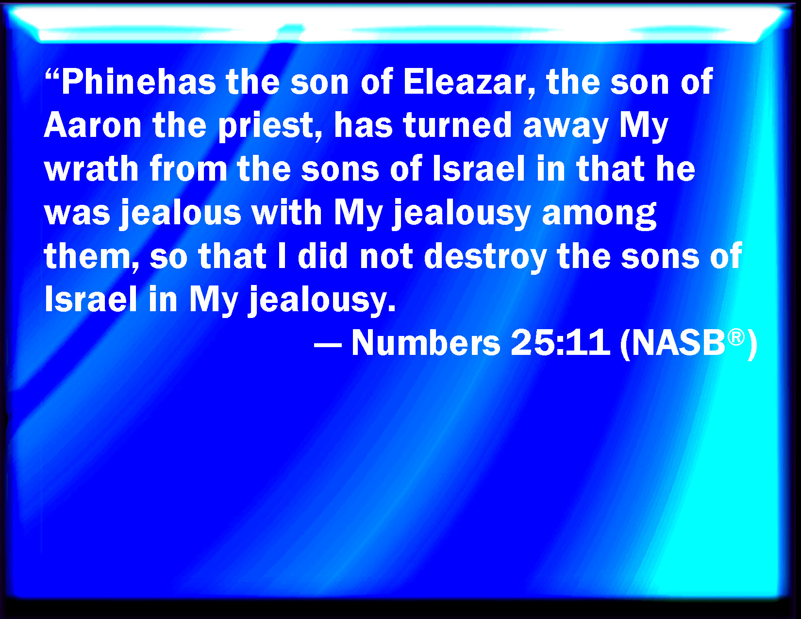 Bible Verse Slide Numbers 25:11 Phinehas, the son of Eleazar, the son of Aaron the priest, has turned my wrath away from the children of Israel, while he was zealous for my sake among them, that I consumed not the children of Israel in my jealousy. KJV: Phinehas, the son of Eleazar, the son of Aaron the priest, hath turned my wrath away from the children of Israel, while he was zealous for my sake among them, that I consumed not the children of Israel in my jealousy. DRB: Phinees the son of Eleazar the son of Aaron the priest, hath turned away my wrath from the children of Israel: because he was moved with my zeal against them, that I myself might not destroy the children of Israel in my zeal. DBT: Phinehas, the son of Eleazar, the son of Aaron the priest, hath turned my wrath away from the children of Israel, in that he was jealous with my jealousy among them, so that I consumed not the children of Israel in my jealousy. ERV: Phinehas, the son of Eleazar, the son of Aaron the priest, hath turned my wrath away from the children of Israel, in that he was jealous with my jealousy among them, so that I consumed not the children of Israel in my jealousy. WBT: Phinehas, the son of Eleazar, the son of Aaron the priest, hath turned my wrath away from the children of Israel, (while he was zealous for my sake among them,) that I consumed not the children of Israel in my jealousy. WEB: "Phinehas, the son of Eleazar, the son of Aaron the priest, has turned my wrath away from the children of Israel, in that he was jealous with my jealousy among them, so that I didn't consume the children of Israel in my jealousy. YLT: 'Phinehas, son of Eleazar, son of Aaron the priest, hath turned back My fury from the sons of Israel, by his being zealous with My zeal in their midst, and I have not consumed the sons of Israel in My zeal.Links Numbers 25:11 NIV • Numbers 25:11 NLT • Numbers 25:11 ESV • Numbers 25:11 NASB • Numbers 25:11 KJV • Numbers 25:11 Interlinear • Numbers 25:11 Commentaries • Numbers 25:11 Parallel Texts • Numbers 25:11 Bible Apps • Numbers 25:11 Parallel • Bible Hub |