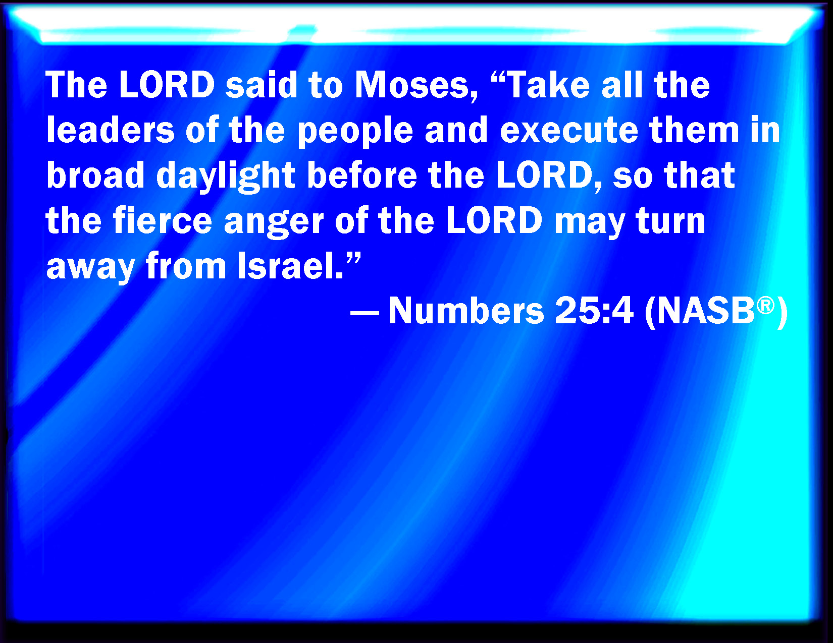 Bible Verse Slide Numbers 25:4 And the LORD said to Moses, Take all the heads of the people, and hang them up before the LORD against the sun, that the fierce anger of the LORD may be turned away from Israel. KJV: And the LORD said unto Moses, Take all the heads of the people, and hang them up before the LORD against the sun, that the fierce anger of the LORD may be turned away from Israel. DRB: Said to Moses: Take all the princes of the people, and hang them up on gibbets against the sun: that my fury may be turned away from Israel. DBT: And Jehovah said to Moses, Take all the heads of the people, and hang them up to Jehovah before the sun, that the fierce anger of Jehovah may be turned away from Israel. ERV: And the LORD said unto Moses, Take all the chiefs of the people, and hang them up unto the LORD before the sun, that the fierce anger of the LORD may turn away from Israel. WBT: And the LORD said to Moses, Take all the heads of the people, and hang them up before the LORD against the sun, that the fierce anger of the LORD may be turned away from Israel. WEB: Yahweh said to Moses, "Take all the chiefs of the people, and hang them up to Yahweh before the sun, that the fierce anger of Yahweh may turn away from Israel." YLT: And Jehovah saith unto Moses, 'Take all the chiefs of the people, and hang them before Jehovah — over-against the sun; and the fierceness of the anger of Jehovah doth turn back from Israel.'Links Numbers 25:4 NIV • Numbers 25:4 NLT • Numbers 25:4 ESV • Numbers 25:4 NASB • Numbers 25:4 KJV • Numbers 25:4 Interlinear • Numbers 25:4 Commentaries • Numbers 25:4 Parallel Texts • Numbers 25:4 Bible Apps • Numbers 25:4 Parallel • Bible Hub |