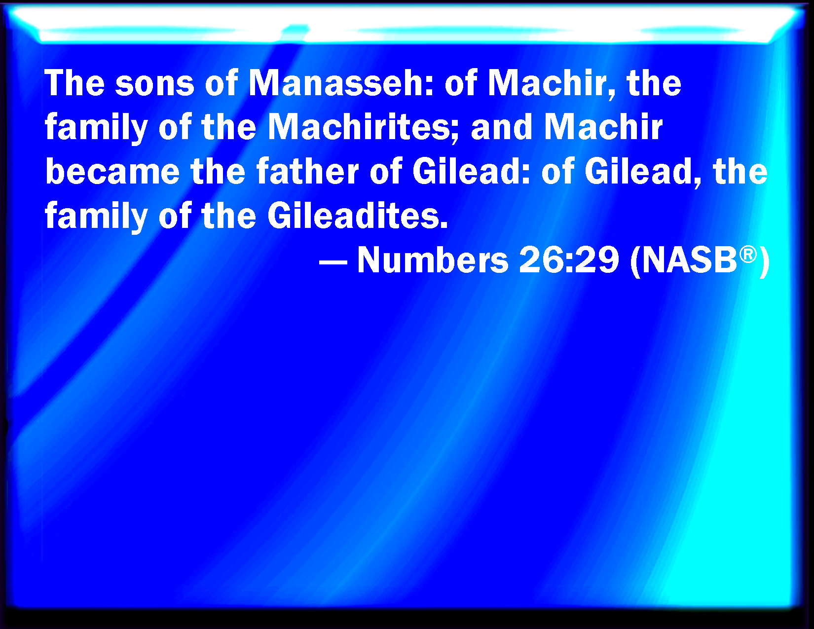 Bible Verse Slide Numbers 26:29 Of the sons of Manasseh: of Machir, the family of the Machirites: and Machir begat Gilead: of Gilead come the family of the Gileadites. KJV: Of the sons of Manasseh: of Machir, the family of the Machirites: and Machir begat Gilead: of Gilead come the family of the Gileadites. DRB: Of Manasses was born Machir, of whom is the family of the Machirites. Machir beget Galaad, of whom is the family of the Galaadites. DBT: The sons of Manasseh: of Machir, the family of the Machirites (and Machir begot Gilead); of Gilead, the family of the Gileadites. ERV: The sons of Manasseh: of Machir, the family of the Machirites: and Machir begat Gilead: of Gilead, the family of the Gileadites. WBT: Of the sons of Manasseh: of Machir, the family of the Machirites: and Machir begat Gilead: of Gilead come the family of the Gileadites. WEB: The sons of Manasseh: of Machir, the family of the Machirites; and Machir became the father of Gilead; of Gilead, the family of the Gileadites. YLT: Sons of Manasseh: of Machir is the family of the Machirite; and Machir hath begotten Gilead; of Gilead is the family of the Gileadite.Links Numbers 26:29 NIV • Numbers 26:29 NLT • Numbers 26:29 ESV • Numbers 26:29 NASB • Numbers 26:29 KJV • Numbers 26:29 Interlinear • Numbers 26:29 Commentaries • Numbers 26:29 Parallel Texts • Numbers 26:29 Bible Apps • Numbers 26:29 Parallel • Bible Hub |