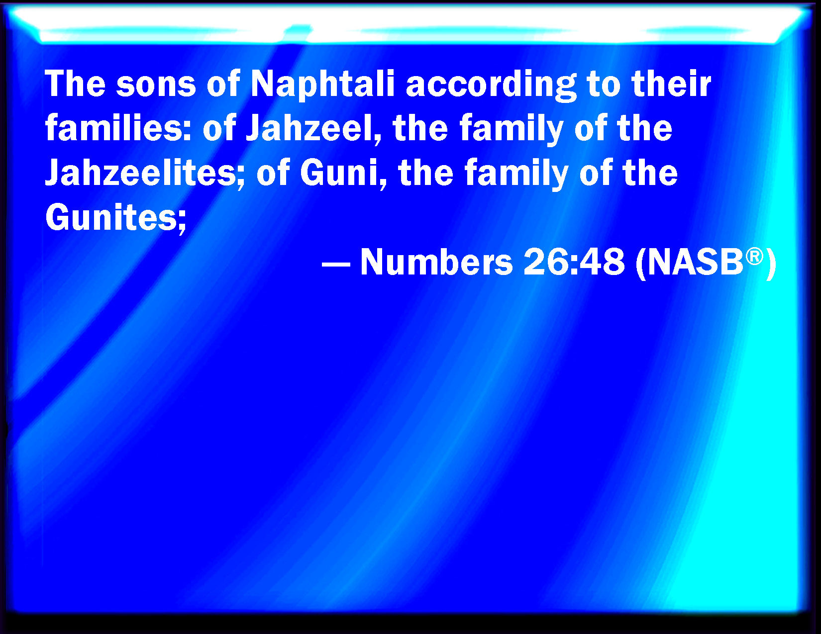 Bible Verse Slide Numbers 26:48 Of the sons of Naphtali after their families: of Jahzeel, the family of the Jahzeelites: of Guni, the family of the Gunites: KJV: Of the sons of Naphtali after their families: of Jahzeel, the family of the Jahzeelites: of Guni, the family of the Gunites: DRB: The sons of Nephtali by their kindreds: Jesiel, of whom is the family of the Jesielites: Guni, of whom is the family of the Gunites: DBT: The sons of Naphtali, after their families: of Jahzeel, the family of the Jahzeelites; of Guni, the family of the Gunites; ERV: The sons of Naphtali after their families: of Jahzeel, the family of the Jahzeelites: of Guni, the family of the Gunites: WBT: Of the sons of Naphtali after their families: of Jahzeel, the family of the Jahzeelites: of Guni, the family of the Gunites: WEB: The sons of Naphtali after their families: of Jahzeel, the family of the Jahzeelites; of Guni, the family of the Gunites; YLT: Sons of Naphtali by their families: of Jahzeel is the family of the Jahzeelite; of Guni the family of the Gunite;Links Numbers 26:48 NIV • Numbers 26:48 NLT • Numbers 26:48 ESV • Numbers 26:48 NASB • Numbers 26:48 KJV • Numbers 26:48 Interlinear • Numbers 26:48 Commentaries • Numbers 26:48 Parallel Texts • Numbers 26:48 Bible Apps • Numbers 26:48 Parallel • Bible Hub |