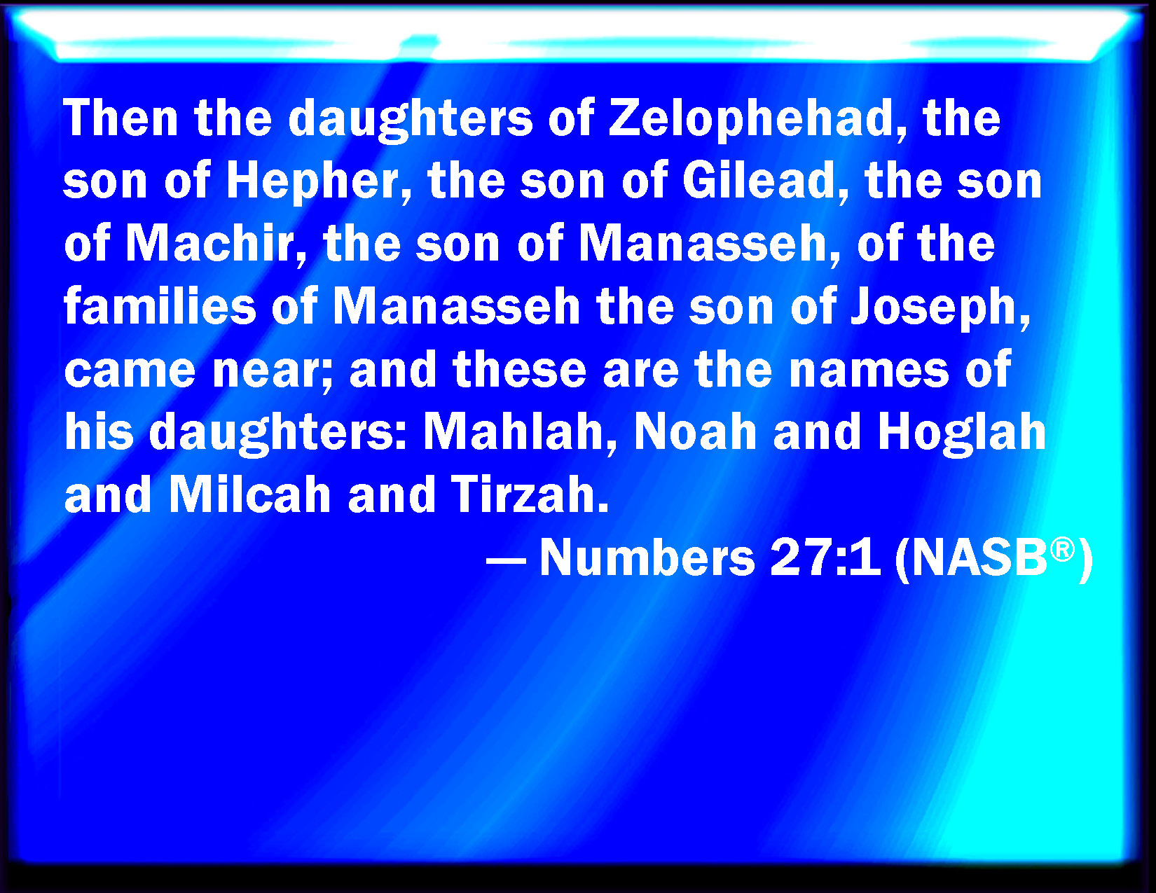 Bible Verse Slide Numbers 27:1 Then came the daughters of Zelophehad, the son of Hepher, the son of Gilead, the son of Machir, the son of Manasseh, of the families of Manasseh the son of Joseph: and these are the names of his daughters; Mahlah, Noah, and Hoglah, and Milcah, and Tirzah. KJV: Then came the daughters of Zelophehad, the son of Hepher, the son of Gilead, the son of Machir, the son of Manasseh, of the families of Manasseh the son of Joseph: and these are the names of his daughters; Mahlah, Noah, and Hoglah, and Milcah, and Tirzah. DRB: Then came the daughters of Salphaad, the son of Hepher, the son of Galaad, the son of Machir, the son of Manasses, who was the son of Joseph: and their names are Maala, and Noa, and Hegla, and Melcha, and Thersa. DBT: Then drew near the daughters of Zelophehad, the son of Hepher, the son of Gilead, the son of Machir, the son of Manasseh, of the families of Manasseh the son of Joseph; and these were the names of his daughters: Mahlah, Noah, and Hoglah, and Milcah, and Tirzah. ERV: Then drew near the daughters of Zelophehad, the son of Hepher, the son of Gilead, the son of Machir, the son of Manasseh, of the families of Manasseh the son of Joseph: and these are the names of his daughters; Mahlah, Noah, and Hoglah, and Milcah, and Tirzah. WBT: Then came the daughters of Zelophehad, the son of Hepher, the son of Gilead, the son of Machir, the son of Manasseh, of the families of Manasseh the son of Joseph: and these are the names of his daughters; Mahlah, Noah, and Hoglah, and Milcah, and Tirzah. WEB: Then drew near the daughters of Zelophehad, the son of Hepher, the son of Gilead, the son of Machir, the son of Manasseh, of the families of Manasseh the son of Joseph; and these are the names of his daughters: Mahlah, Noah, and Hoglah, and Milcah, and Tirzah. YLT: And daughters of Zelophehad son of Hepher, son of Gilead, son of Machir, son of Manasseh, of the families of Manasseh son of Joseph, draw near — and these are the names of his daughters, Mahlah, Noah, and Hoglah, and Milcah, and Tirzah — Links Numbers 27:1 NIV • Numbers 27:1 NLT • Numbers 27:1 ESV • Numbers 27:1 NASB • Numbers 27:1 KJV • Numbers 27:1 Interlinear • Numbers 27:1 Commentaries • Numbers 27:1 Parallel Texts • Numbers 27:1 Bible Apps • Numbers 27:1 Parallel • Bible Hub |